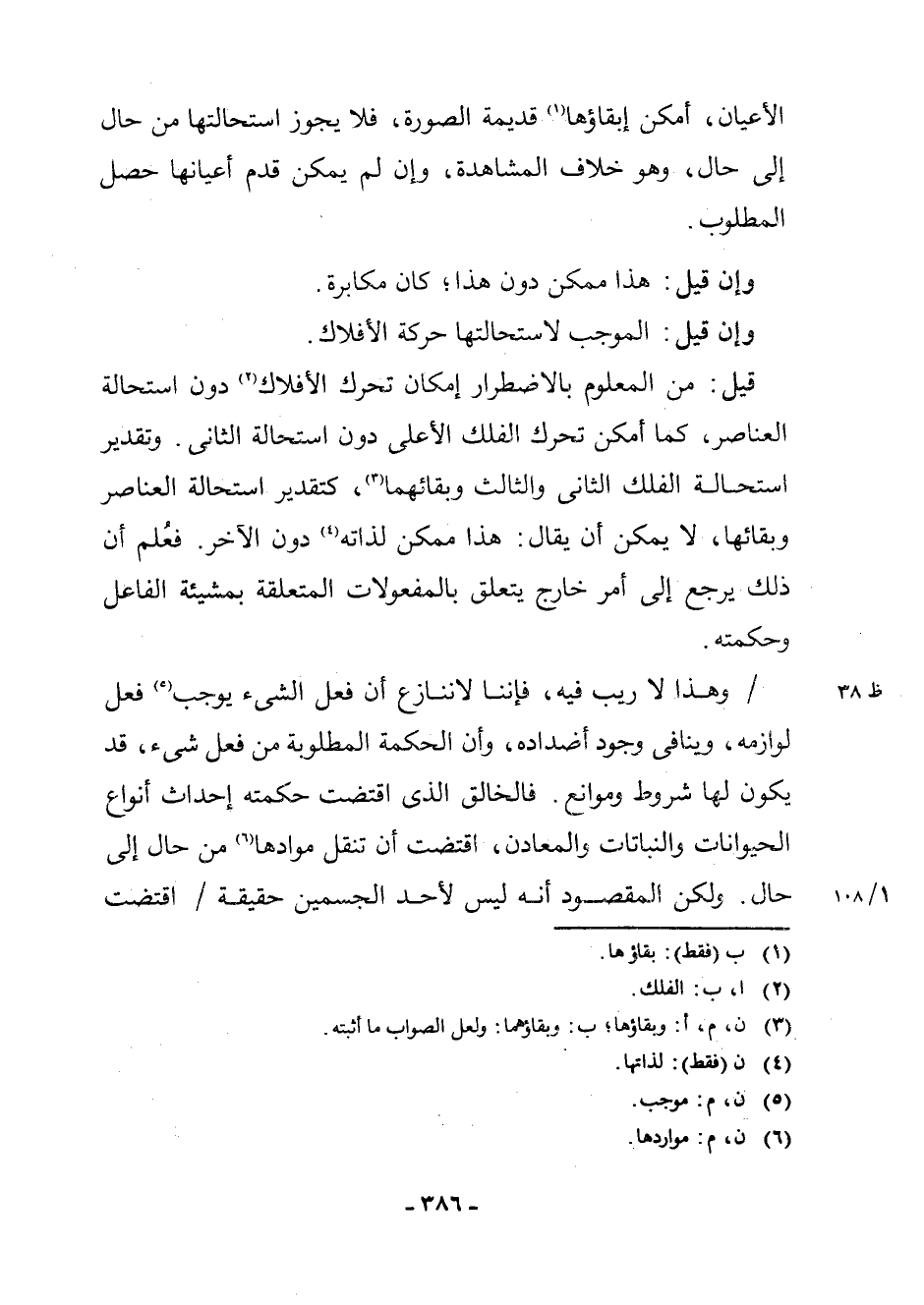 قِيلَ: مِنَ الْمَعْلُومِ بِالِاضْطِرَارِ إِمْكَانُ تَحَرُّكِ الْأَفْلَاكِ (¬2) دُونَ اسْتِحَالَةِ الْعَنَاصِرِ، كَمَا أَمْكَنَ تَحَرُّكُ الْفَلَكِ الْأَعْلَى دُونَ اسْتِحَالَةِ الثَّانِي. وَتَقْدِيرُ اسْتِحَالَةِ الْفَلَكِ الثَّانِي وَالثَّالِثِ وَبَقَائِهِمَا (¬3) ، كَتَقْدِيرِ اسْتِحَالَةِ الْعَنَاصِرِ وَبَقَائِهَا، لَا يُمْكِنُ أَنْ يُقَالَ: هَذَا مُمْكِنٌ لِذَاتِهِ (¬4) دُونَ الْآخَرِ. فَعُلِمَ أَنَّ ذَلِكَ يَرْجِعُ إِلَى أَمْرٍ خَارِجٍ يَتَعَلَّقُ بِالْمَفْعُولَاتِ الْمُتَعَلِّقَةِ بِمَشِيئَةِ الْفَاعِلِ وَحِكْمَتِهِ.