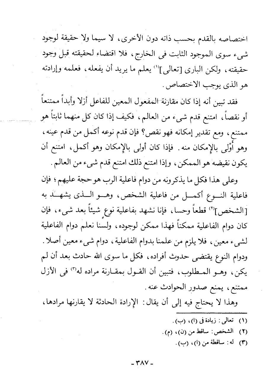 فَقَدْ تَبَيَّنَ أَنَّهُ إِذَا كَانَ مُقَارَنَةُ الْمَفْعُولِ الْمُعَيَّنِ لِلْفَاعِلِ أَزَلًا وَأَبَدًا مُمْتَنَعًا أَوْ نَقْصًا، امْتَنَعَ قِدَمُ شَيْءٍ مِنَ الْعَالَمِ، فَكَيْفَ إِذَا كَانَ كُلٌّ مِنْهُمَا ثَابِتًا هُوَ مُمْتَنَعٌ، وَمَعَ تَقْدِيرِ إِمْكَانِهِ فَهُوَ نَقْصٌ؟ فَإِنَّ قِدَمَ نَوْعِهِ أَكْمَلُ مِنْ قِدَمِ عَيْنِهِ، وَهُوَ أَوْلَى بِالْإِمْكَانِ مِنْهُ. فَإِذَا كَانَ أَوْلَى بِالْإِمْكَانِ وَهُوَ أَكْمَلُ، امْتَنَعَ أَنْ يَكُونَ نَقِيضُهُ هُوَ الْمُمْكِنُ، وَإِذَا امْتَنَعَ ذَلِكَ امْتَنَعَ قِدَمُ شَيْءٍ مِنَ الْعَالَمِ.