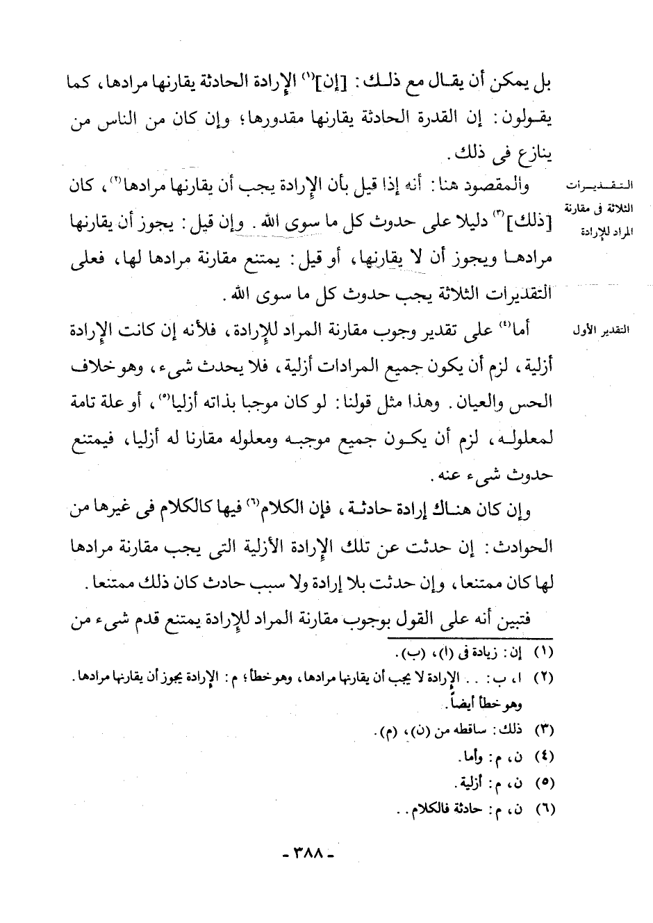 وَالْمَقْصُودُ هُنَا: أَنَّهُ إِذَا قِيلَ بِأَنَّ الْإِرَادَةَ يَجِبُ أَنْ يُقَارِنَهَا مُرَادُهَا (¬2) ، كَانَ [ذَلِكَ] (¬3) دَلِيلًا عَلَى حُدُوثِ كُلِّ مَا سِوَى اللَّهِ. وَإِنْ قِيلَ: يَجُوزُ أَنْ يُقَارِنَهَا مُرَادُهَا وَيَجُوزُ أَنْ لَا يُقَارِنَهَا، أَوْ قِيلَ: يُمْتَنَعُ مُقَارَنَةُ مُرَادِهَا لَهَا، فَعَلَى التَّقْدِيرَاتِ الثَّلَاثَةِ يَجِبُ حُدُوثُ كُلِّ مَا سِوَى اللَّهِ.