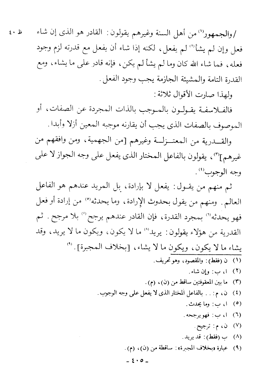 وَالْجُمْهُورُ (¬1) مِنْ أَهْلِ السُّنَّةِ وَغَيْرِهِمْ يَقُولُونَ: الْقَادِرُ هُوَ الَّذِي إِنْ شَاءَ فَعَلَ وَإِنْ لَمْ يَشَأْ (¬2) لَمْ يَفْعَلْ، لَكِنَّهُ إِذَا شَاءَ أَنْ يَفْعَلَ مَعَ قُدْرَتِهِ، لَزِمَ وُجُودُ فِعْلِهِ، فَمَا شَاءَ اللَّهُ كَانَ وَمَا لَمْ يَشَأْ لَمْ يَكُنْ، فَإِنَّهُ قَادِرٌ عَلَى مَا يَشَاءُ، وَمَعَ الْقُدْرَةِ التَّامَّةِ وَالْمَشِيئَةِ الْجَازِمَةِ يَجِبُ وُجُودُ الْفِعْلِ.