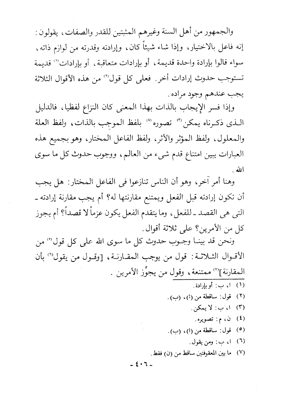 وَالْجُمْهُورُ مِنْ أَهْلِ السُّنَّةِ وَغَيْرِهِمُ الْمُثْبِتِينَ لِلْقَدَرِ وَالصِّفَاتِ، يَقُولُونَ: إِنَّهُ فَاعِلٌ بِالِاخْتِيَارِ، وَإِذَا شَاءَ شَيْئًا كَانَ، وَإِرَادَتُهُ وَقُدْرَتُهُ مِنْ لَوَازِمِ ذَاتِهِ، سَوَاءٌ قَالُوا بِإِرَادَةٍ وَاحِدَةٍ قَدِيمَةٍ، أَوْ بِإِرَادَاتٍ مُتَعَاقِبَةٍ، أَوْ بِإِرَادَاتٍ (¬1) قَدِيمَةٍ تَسْتَوْجِبُ حُدُوثَ إِرَادَاتٍ أُخَرَ. فَعَلَى كُلِّ قَوْلٍ (¬2) مِنْ هَذِهِ الْأَقْوَالِ الثَّلَاثَةِ يَجِبُ عِنْدَهُمْ وُجُودُ مُرَادِهِ.