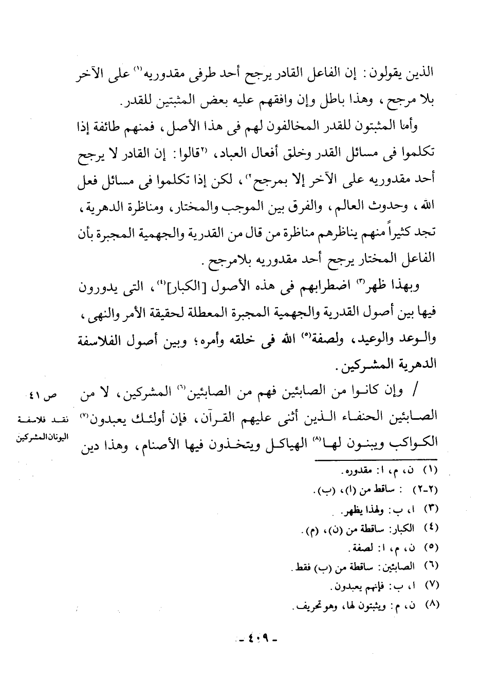 وَأَمَّا الْمُثْبِتُونَ لِلْقَدَرِ الْمُخَالِفُونَ لَهُمْ فِي هَذَا الْأَصْلِ، فَمِنْهُمْ طَائِفَةٌ إِذَا تَكَلَّمُوا فِي مَسَائِلِ الْقَدَرِ وَخَلْقِ أَفْعَالِ الْعِبَادِ، (2 قَالُوا: إِنَّ الْقَادِرَ لَا يُرَجِّحُ أَحَدَ مَقْدُورَيْهِ عَلَى الْآخَرِ إِلَّا بِمُرَجِّحٍ 2) (¬2) ، لَكِنْ إِذَا تَكَلَّمُوا فِي مَسَائِلِ فِعْلِ اللَّهِ، وَحُدُوثِ الْعَالَمِ، وَالْفَرْقِ بَيْنَ الْمُوجِبِ وَالْمُخْتَارِ، وَمُنَاظَرَةِ الدَّهْرِيَّةِ، تَجِدُ كَثِيرًا مِنْهُمْ يُنَاظِرُهُمْ مُنَاظَرَةَ مَنْ قَالَ مِنَ الْقَدَرِيَّةِ وَالْجَهْمِيَّةِ الْمُجْبِرَةِ بِأَنَّ الْفَاعِلَ الْمُخْتَارَ يُرَجِّحُ أَحَدَ مَقْدُورَيْهِ بِلَا مُرَجِّحٍ.
