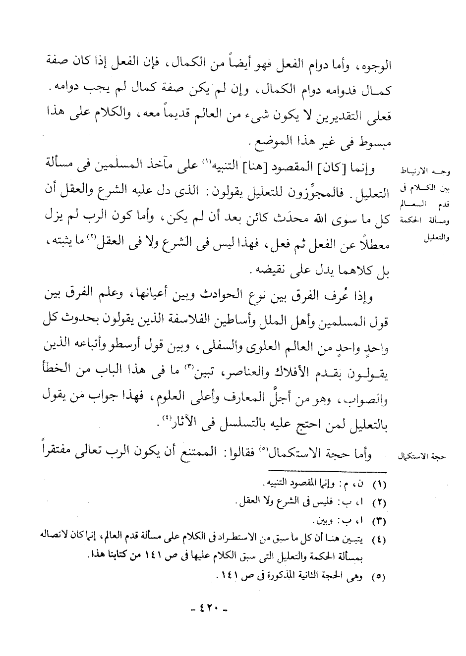 (¬4) يَتَبَيَّنُ هُنَا أَنَّ كُلَّ مَا سَبَقَ مِنَ الِاسْتِطْرَادِ فِي الْكَلَامِ عَلَى مَسْأَلَةِ قِدَمِ الْعَالَمِ، إِنَّمَا كَانَ لِاتِّصَالِهِ بِمَسْأَلَةِ الْحِكْمَةِ وَالتَّعْلِيلِ الَّتِي سَبَقَ الْكَلَامُ عَلَيْهَا فِي ص 141 مِنْ كِتَابِنَا هَذَا.