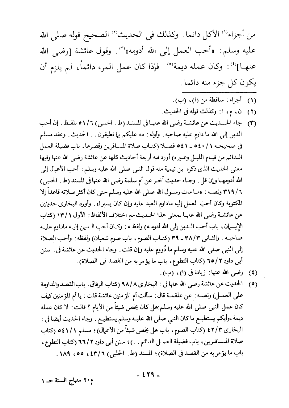 (¬5) الْحَدِيثُ عَنْ عَائِشَةَ - رَضِيَ اللَّهُ عَنْهَا - فِي: الْبُخَارِيِّ 8/98 (كِتَابُ الرِّقَاقِ، بَابُ الْقَصْدِ وَالْمُدَاوَمَةِ عَلَى الْعَمَلِ) وَنَصُّهُ: عَنْ عَلْقَمَةَ قَالَ: سَأَلْتُ أُمَّ الْمُؤْمِنِينَ عَائِشَةَ قُلْتُ: يَا أُمَّ الْمُؤْمِنِينَ كَيْفَ كَانَ عَمَلُ النَّبِيِّ - صَلَّى اللَّهُ عَلَيْهِ وَسَلَّمَ -: هَلْ كَانَ يَخُصُّ شَيْئًا مِنَ الْأَيَّامِ؟ قَالَتْ: لَا كَانَ عَمَلُهُ دِيمَةً، وَأَيُّكُمْ يَسْتَطِيعُ مَا كَانَ النَّبِيُّ - صَلَّى اللَّهُ عَلَيْهِ وَسَلَّمَ - يَسْتَطِيعُ. وَجَاءَ الْحَدِيثُ أَيْضًا فِي: الْبُخَارِيِّ 3/42 (كِتَابُ الصَّوْمِ، بَابُ هَلْ يَخُصُّ شَيْئًا مِنَ الْأَعْمَالِ) ؛ مُسْلِمٍ 1/541 (كِتَابُ صَلَاةِ الْمُسَافِرِينَ، بَابُ فَضِيلَةِ الْعَمَلِ الدَّائِمِ. .) ؛ سُنَنِ أَبِي دَاوُدَ 2/66 (كِتَابُ التَّطَوُّعِ، بَابُ مَا يُؤْمَرُ بِهِ مِنَ الْقَصْدِ فِي الصَّلَاةِ) ؛ الْمُسْنَدِ (ط. الْحَلَبِيِّ) 6/43، 55، 189.