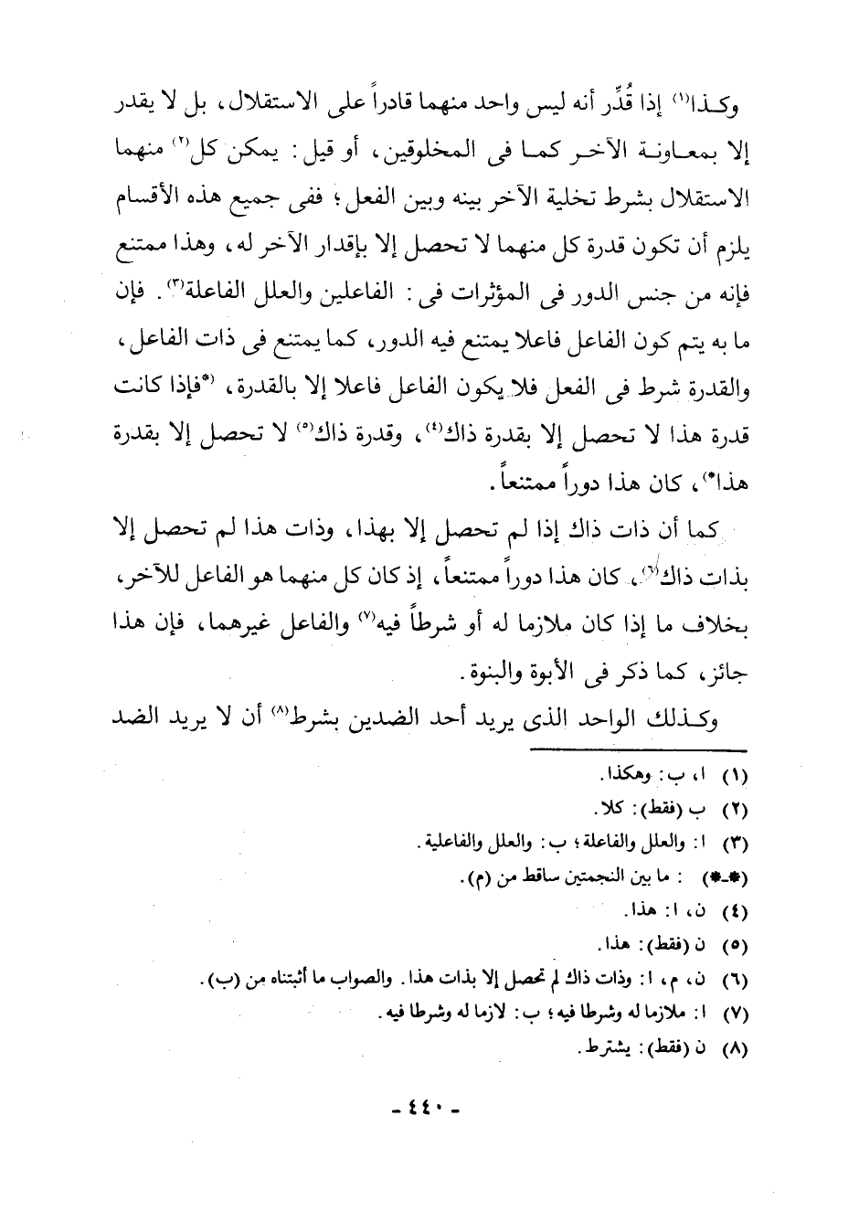وَكَذَا (¬1) إِذَا قُدِّرَ أَنَّهُ لَيْسَ وَاحِدٌ مِنْهُمَا قَادِرًا عَلَى الِاسْتِقْلَالِ، بَلْ لَا يَقْدِرُ إِلَّا بِمُعَاوَنَةِ الْآخَرِ كَمَا فِي الْمَخْلُوقِينَ، أَوْ قِيلَ: يُمْكِنُ كُلٌّ (¬2) مِنْهُمَا الِاسْتِقْلَالَ بِشَرْطِ تَخْلِيَةِ الْآخَرِ بَيْنَهُ وَبَيْنَ الْفِعْلِ، فَفِي جَمِيعِ هَذِهِ الْأَقْسَامِ يَلْزَمُ أَنْ تَكُونَ قُدْرَةُ كُلٍّ مِنْهُمَا لَا تَحْصُلُ إِلَّا بِإِقْدَارِ الْآخَرِ لَهُ، وَهَذَا مُمْتَنَعٌ، فَإِنَّهُ مِنْ جِنْسِ الدَّوْرِ فِي الْمُؤَثِّرَاتِ فِي الْفَاعِلِينَ وَالْعِلَلِ الْفَاعِلَةِ (¬3) . فَإِنَّ مَا بِهِ يَتِمُّ كَوْنُ الْفَاعِلِ فَاعِلًا يُمْتَنَعُ فِيهِ الدَّوْرُ، كَمَا يُمْتَنَعُ فِي ذَاتِ الْفَاعِلِ، وَالْقُدْرَةُ شَرْطٌ فِي الْفِعْلِ، فَلَا يَكُونُ الْفَاعِلُ فَاعِلًا إِلَّا بِالْقُدْرَةِ، (* فَإِذَا كَانَتْ قُدْرَةُ هَذَا لَا تَحْصُلُ إِلَّا بِقُدْرَةِ ذَاكَ (¬4) ، وَقُدْرَةُ ذَاكَ (¬5) لَا تَحْصُلُ إِلَّا بِقُدْرَةِ هَذَا *) (¬6) كَانَ هَذَا دَوْرًا مُمْتَنَعًا.