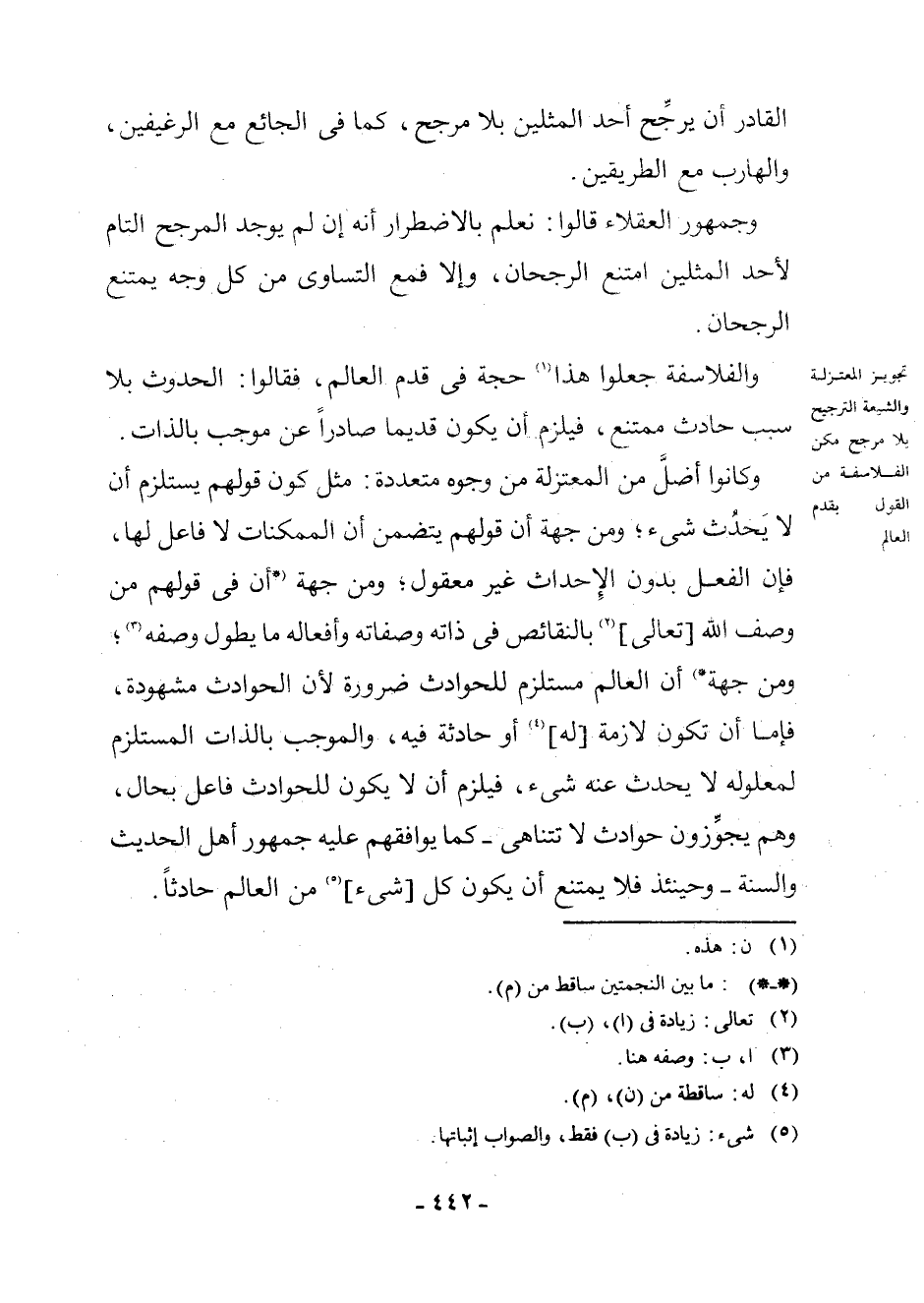وَجُمْهُورُ الْعُقَلَاءِ قَالُوا: نَعْلَمُ بِالِاضْطِرَارِ أَنَّهُ إِنْ لَمْ يُوجَدِ الْمُرَجِّحُ التَّامُّ لِأَحَدِ الْمِثْلَيْنِ امْتَنَعَ الرُّجْحَانُ، وَإِلَّا فَمَعَ التَّسَاوِي مِنْ كُلِّ وَجْهٍ يُمْتَنَعُ الرُّجْحَانُ.
