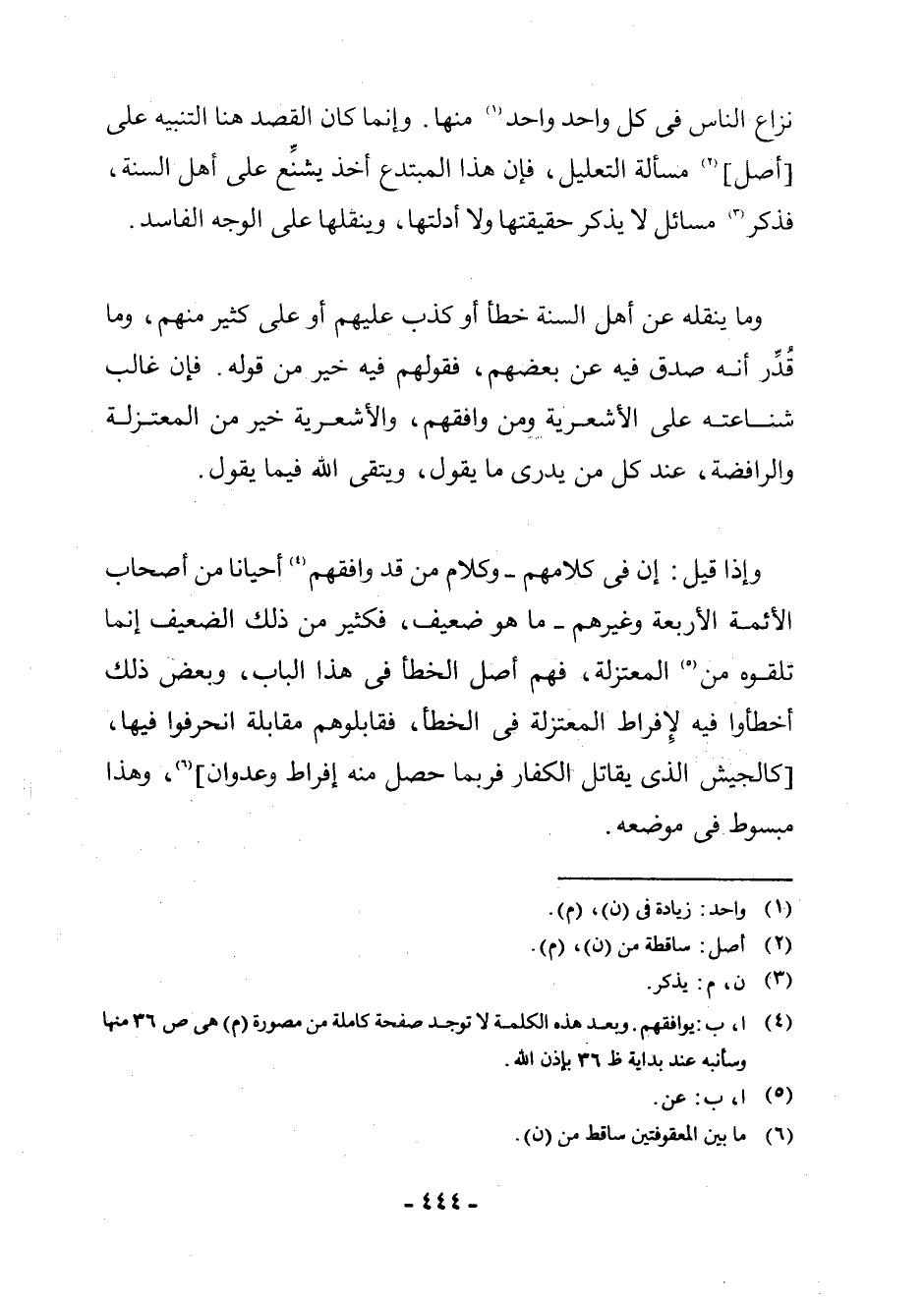 وَإِذَا قِيلَ: إِنَّ فِي كَلَامِهِمْ - وَكَلَامِ مَنْ قَدْ وَافَقَهُمْ (¬4) أَحْيَانًا مِنْ أَصْحَابِ الْأَئِمَّةِ الْأَرْبَعَةِ وَغَيْرِهِمْ - مَا هُوَ ضَعِيفٌ، فَكَثِيرٌ مِنْ ذَلِكَ الضَّعِيفِ إِنَّمَا تَلَقَّوْهُ مِنَ (¬5) الْمُعْتَزِلَةِ، فَهُمْ أَصْلُ الْخَطَأِ فِي هَذَا الْبَابِ، وَبَعْضُ ذَلِكَ أَخْطَئُوا فِيهِ لِإِفْرَاطِ الْمُعْتَزِلَةِ فِي الْخَطَأِ، فَقَابَلُوهُمْ مُقَابَلَةً انْحَرَفُوا فِيهَا، [كَالْجَيْشِ الَّذِي يُقَاتِلُ الْكُفَّارَ فَرُبَّمَا حَصَلَ مِنْهُ إِفْرَاطٌ وَعُدْوَانٌ] (¬6) ، وَهَذَا مَبْسُوطٌ فِي مَوْضِعِهِ.