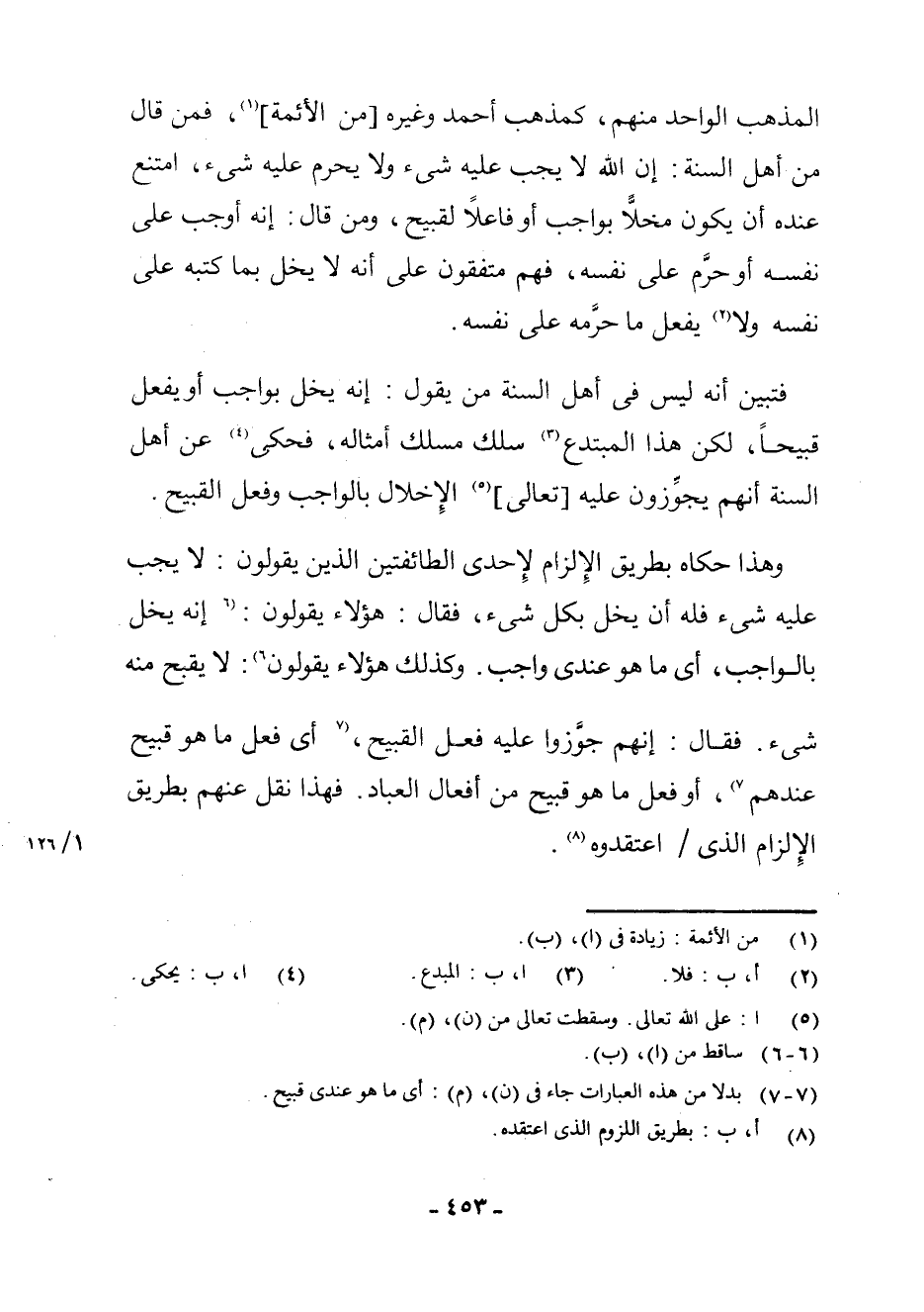 وَهَذَا حَكَاهُ بِطَرِيقِ الْإِلْزَامِ لِإِحْدَى الطَّائِفَتَيْنِ الَّذِينَ يَقُولُونَ: لَا يَجِبُ عَلَيْهِ شَيْءٌ فَلَهُ أَنْ يُخِلَّ بِكُلِّ شَيْءٍ، فَقَالَ: هَؤُلَاءِ يَقُولُونَ: (6 إِنَّهُ يُخِلُّ بِالْوَاجِبِ، أَيْ مَا هُوَ عِنْدِي وَاجِبٌ. وَكَذَلِكَ هَؤُلَاءِ يَقُولُونَ 6) (¬6) : لَا يُقَبَّحُ مِنْهُ شَيْءٌ. فَقَالَ: إِنَّهُمْ جَوَّزُوا عَلَيْهِ فِعْلَ الْقَبِيحِ، (7 أَيْ: فِعْلَ مَا هُوَ قَبِيحٌ عِنْدَهُمْ 7) (¬7) أَوْ فِعْلَ مَا هُوَ قَبِيحٌ مِنْ أَفْعَالِ الْعِبَادِ. فَهَذَا نَقْلٌ عَنْهُمْ بِطَرِيقِ الْإِلْزَامِ الَّذِي اعْتَقَدُوهُ (¬8) .