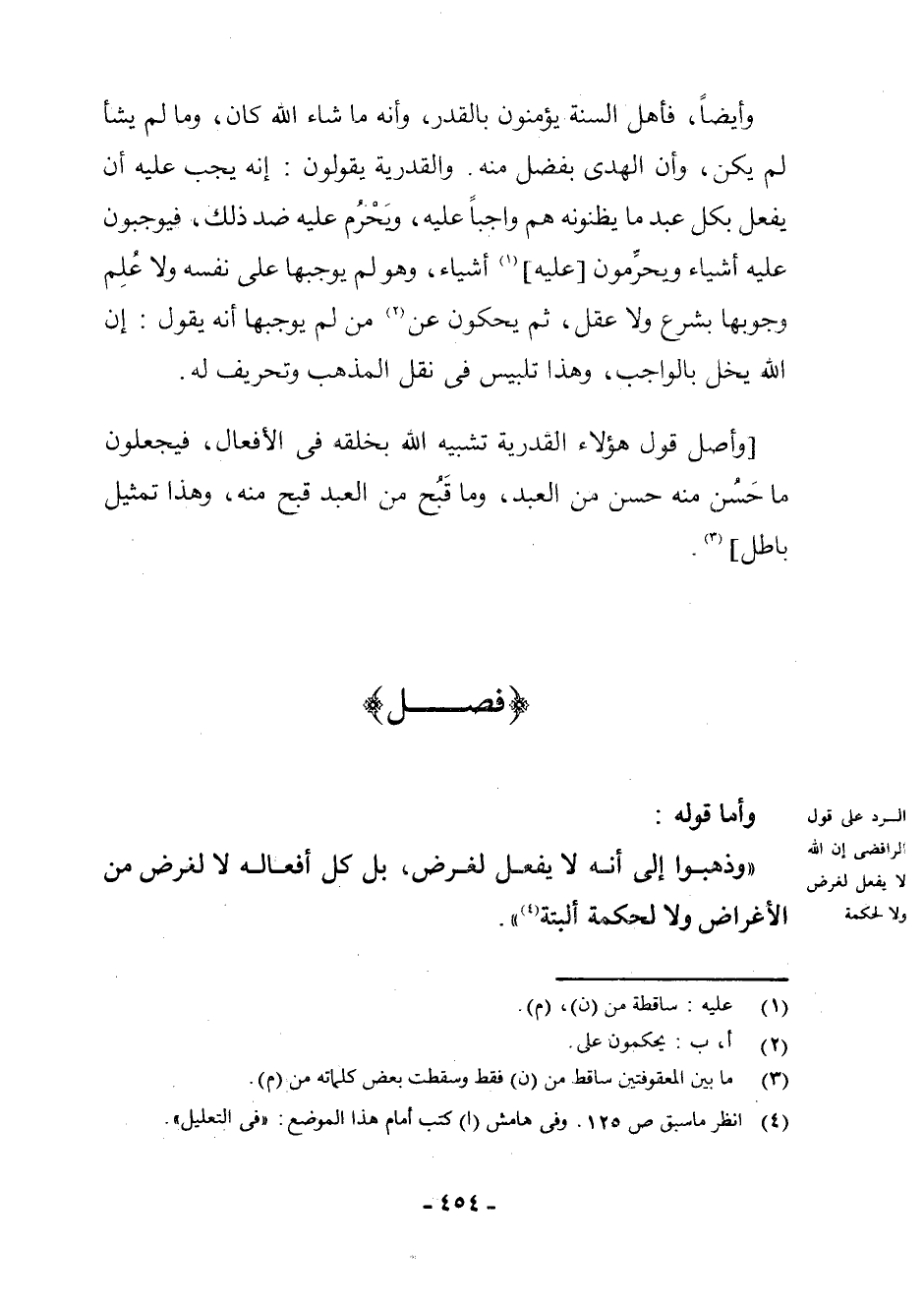 وَأَمَّا قَوْلُهُ: " وَذَهَبُوا إِلَى أَنَّهُ لَا يَفْعَلُ لِغَرَضٍ، بَلْ كُلُّ أَفْعَالِهِ لَا لِغَرَضٍ مِنَ الْأَغْرَاضِ وَلَا لِحِكْمَةِ أَلْبَتَّةَ (¬4) ".