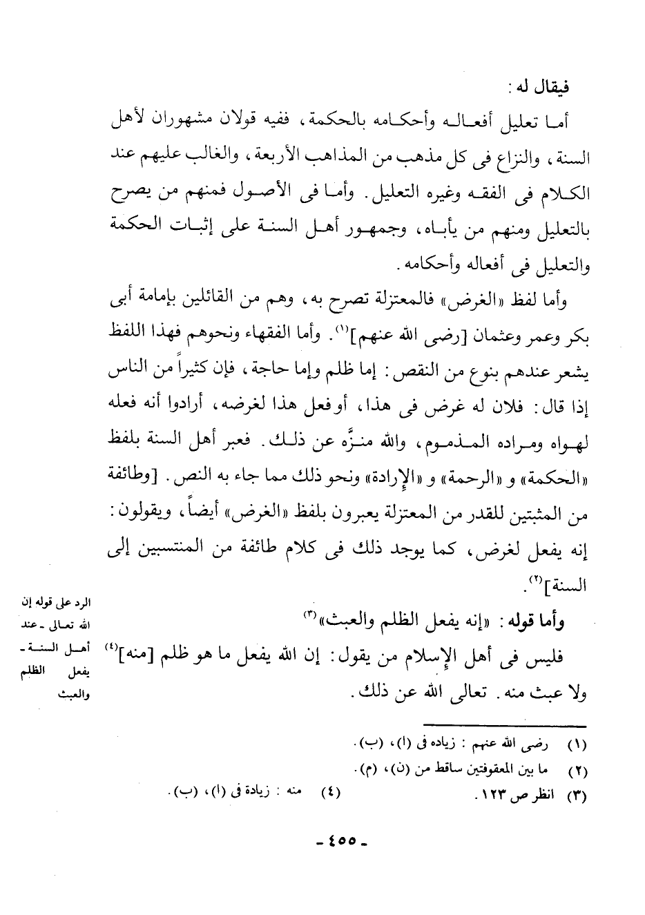 فَلَيْسَ فِي أَهْلِ الْإِسْلَامِ مَنْ يَقُولُ: إِنَّ اللَّهَ يَفْعَلُ مَا هُوَ ظُلْمٌ (¬4) مِنْهُ وَلَا عَبَثٌ مِنْهُ. تَعَالَى اللَّهُ عَنْ ذَلِكَ.