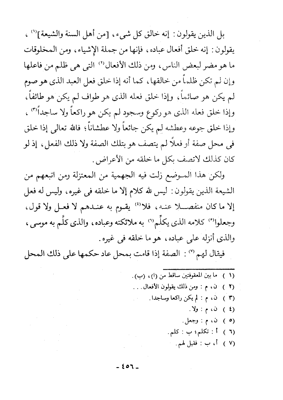 يَقُولُونَ: إِنَّهُ خَلَقَ أَفْعَالَ عِبَادِهِ، فَإِنَّهَا مِنْ جُمْلَةِ الْأَشْيَاءِ، وَمِنَ الْمَخْلُوقَاتِ مَا هُوَ مُضِرٌّ لِبَعْضِ النَّاسِ، وَمِنْ ذَلِكَ الْأَفْعَالُ (¬2) الَّتِي هِيَ ظُلْمٌ مِنْ فَاعِلِهَا وَإِنْ لَمْ تَكُنْ ظُلْمًا مِنْ خَالِقِهَا، كَمَا أَنَّهُ إِذَا خَلَقَ فِعْلَ الْعَبْدِ الَّذِي هُوَ صَوْمٌ لَمْ يَكُنْ هُوَ صَائِمًا، وَإِذَا خَلَقَ فِعْلَهُ الَّذِي هُوَ طَوَافٌ لَمْ يَكُنْ هُوَ طَائِفًا، وَإِذَا خَلَقَ فِعْلَهُ الَّذِي هُوَ رُكُوعٌ وَسُجُودٌ لَمْ يَكُنْ هُوَ رَاكِعًا وَلَا سَاجِدًا (¬3) ، وَإِذَا خَلَقَ جُوعَهُ وَعَطَشَهُ لَمْ يَكُنْ جَائِعًا وَلَا عَطْشَانًا؛ فَاللَّهُ تَعَالَى إِذَا خَلَقَ فِي مَحَلٍّ صِفَةً أَوْ فِعْلًا لَمْ يَتَّصِفْ هُوَ بِتِلْكَ الصِّفَةِ وَلَا ذَلِكَ الْفِعْلِ، إِذْ لَوْ كَانَ كَذَلِكَ لَاتَّصَفَ بِكُلِّ مَا خَلَقَهُ مِنَ الْأَعْرَاضِ.
