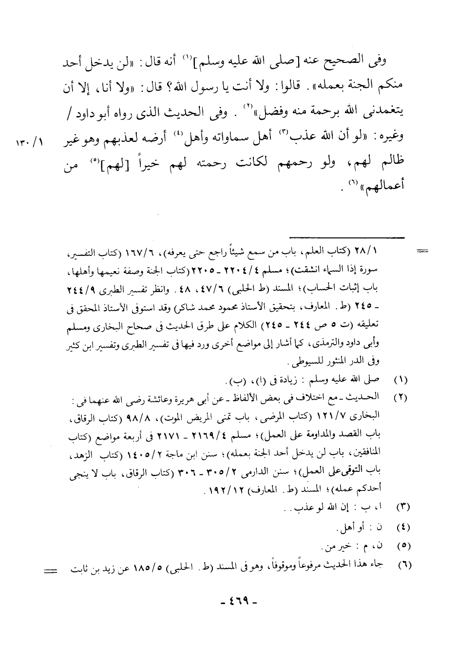 (¬6) جَاءَ هَذَا الْحَدِيثُ مَرْفُوعًا وَمَوْقُوفًا، وَهُوَ فِي الْمُسْنَدِ (ط. الْحَلَبِيِّ) 5/185 عَنْ زَيْدِ بْنِ ثَابِتٍ - رَضِيَ اللَّهُ عَنْهُ - مَرْفُوعًا وَنَصُّهُ فِيهِ:. . . عَنِ ابْنِ الدَّيْلِمِيِّ قَالَ: وَقَعَ فِي نَفْسِي شَيْءٌ مِنَ الْقَدَرِ فَأَتَيْتُ زَيْدَ بْنَ ثَابِتٍ فَسَأَلْتُهُ فَقَالَ: سَمِعْتُ رَسُولَ اللَّهِ - صَلَّى اللَّهُ عَلَيْهِ وَسَلَّمَ - يَقُولُ: " لَوْ أَنَّ اللَّهَ عَذَّبَ أَهْلَ سَمَاوَاتِهِ وَأَهْلَ أَرْضِهِ لَعَذَّبَهُمْ غَيْرَ ظَالِمٍ لَهُمْ، وَلَوْ رَحِمَهُمْ كَانَتْ رَحْمَتُهُ لَهُمْ خَيْرًا مِنْ أَعْمَالِهِمْ، وَلَوْ كَانَ لَكَ جَبَلُ أُحُدٍ أَوْ مِثْلُ جَبَلِ أُحُدٍ ذَهَبًا أَنْفَقْتَهُ فِي سَبِيلِ اللَّهِ مَا قَبِلَهُ مِنْكَ حَتَّى تُؤْمِنَ بِالْقَدَرِ وَتَعْلَمَ أَنَّ مَا أَصَابَكَ لَمْ يَكُنْ لِيُخْطِئَكَ، وَأَنَّ مَا أَخْطَأَكَ لَمْ يَكُنْ لِيُصِيبَكَ، وَأَنَّكَ إِنْ مُتَّ عَلَى غَيْرِ هَذَا دَخَلْتَ النَّارَ ". وَالْحَدِيثُ فِي سُنَنِ أَبِي دَاوُدَ 4/310 - 311 (كِتَابُ السُّنَّةِ، بَابٌ فِي الْقَدَرِ) وَنَصُّهُ فِيهِ:. . عَنِ ابْنِ الدَّيْلِمِيِّ قَالَ: أَتَيْتُ أُبَيَّ بْنَ كَعْبٍ فَقُلْتُ لَهُ: وَقَعَ فِي نَفْسِي شَيْءٌ مِنَ الْقَدَرِ، فَحَدِّثْنِي بِشَيْءٍ لَعَلَّ اللَّهَ أَنْ يُذْهِبَهُ مِنْ قَلْبِي، قَالَ: لَوْ أَنَّ اللَّهَ عَذَّبَ أَهْلَ سَمَاوَاتِهِ. . . . وَلَوْ مُتَّ عَلَى غَيْرِ هَذَا لَدَخَلْتَ النَّارَ. قَالَ: ثُمَّ أَتَيْتُ عَبْدَ اللَّهِ بْنَ مَسْعُودٍ فَقَالَ مِثْلَ ذَلِكَ، قَالَ: ثُمَّ أَتَيْتُ حُذَيْفَةَ بْنَ الْيَمَانِ فَقَالَ مِثْلَ ذَلِكَ، قَالَ: ثُمَّ أَتَيْتُ زَيْدَ بْنَ ثَابِتٍ فَحَدَّثَنِي عَنِ النَّبِيِّ - صَلَّى اللَّهُ عَلَيْهِ وَسَلَّمَ - مِثْلَ ذَلِكَ، وَالْحَدِيثُ فِي سُنَنِ ابْنِ مَاجَهْ 1/29 - 30 (الْمُقَدِّمَةُ، بَابٌ فِي الْقَدَرِ) . وَصَحَّحَ الْأَلْبَانِيُّ الْحَدِيثَ فِي صَحِيحِ الْجَامِعِ الصَّغِيرِ 1/57 - 58. "