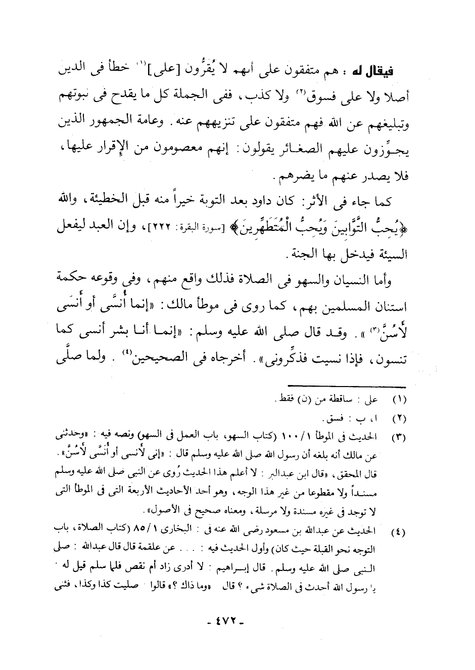 (¬4) الْحَدِيثُ عَنْ عَبْدِ اللَّهِ بْنِ مَسْعُودٍ - رَضِيَ اللَّهُ عَنْهُ - فِي الْبُخَارِيِّ 1/85 (كِتَابُ الصَّلَاةِ، بَابُ التَّوَجُّهِ نَحْوَ الْقِبْلَةِ حَيْثُ كَانَ) وَأَوَّلُ الْحَدِيثِ فِيهِ:. . . عَنْ عَلْقَمَةَ قَالَ: قَالَ عَبْدُ اللَّهِ: صَلَّى النَّبِيُّ - صَلَّى اللَّهُ عَلَيْهِ وَسَلَّمَ -. قَالَ إِبْرَاهِيمُ: لَا أَدْرِي زَادَ أَمْ نَقَصَ فَلَمَّا سَلَّمَ قِيلَ لَهُ: يَا رَسُولَ اللَّهِ، أَحَدَثَ فِي الصَّلَاةِ شَيْءٌ؟ قَالَ: " وَمَا ذَاكَ؟ " قَالُوا: صَلَّيْتَ كَذَا وَكَذَا، فَثَنَى رِجْلَيْهِ وَاسْتَقْبَلَ الْقِبْلَةَ وَسَجَدَ سَجْدَتَيْنِ ثُمَّ سَلَّمَ، فَلَمَّا أَقْبَلَ عَلَيْنَا بِوَجْهِهِ قَالَ: " إِنَّهُ لَوْ حَدَثَ فِي الصَّلَاةِ شَيْءٌ لَنَبَّأْتُكُمْ بِهِ، وَلَكِنْ إِنَّمَا أَنَا بَشَرٌ مِثْلُكُمْ. . الْحَدِيثَ. وَهُوَ فِي مُسْلِمٍ 1/402 - 403 (كِتَابُ الْمَسَاجِدِ وَمَوَاضِعِ الصَّلَاةِ، بَابُ السَّهْوِ فِي الصَّلَاةِ وَالسُّجُودِ لَهُ) ؛ سُنَنِ أَبِي دَاوُدَ 1/368 (كِتَابُ الصَّلَاةِ، بَابُ إِذَا صَلَّى خَمْسًا) ؛ سُنَنِ ابْنِ مَاجَهْ 1/380 (كِتَابُ إِقَامَةِ الصَّلَاةِ، بَابُ السَّهْوِ فِي الصَّلَاةِ) ؛ الْمُسْنَدِ (ط. الْمَعَارِفِ) 5/212، 6/52 - 53، 102.