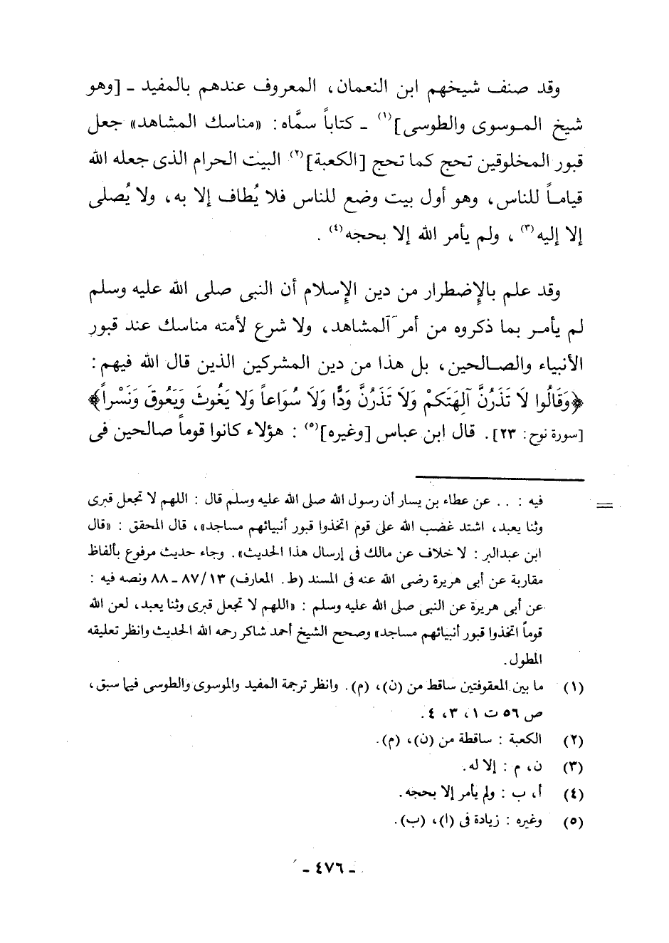 وَقَدْ صَنَّفَ شَيْخُهُمُ ابْنُ النُّعْمَانِ، الْمَعْرُوفُ عِنْدَهُمْ بِالْمُفِيدِ -[وَهُوَ شَيْخُ الْمُوسَوِيِّ وَالطُّوسِيِّ] (¬1) - كِتَابًا سَمَّاهُ: " مَنَاسِكُ الْمَشَاهِدِ " جَعَلَ قُبُورَ الْمَخْلُوقِينَ تُحَجُّ كَمَا تُحَجُّ [الْكَعْبَةُ] (¬2) الْبَيْتُ الْحَرَامُ الَّذِي جَعَلَهُ اللَّهُ قِيَامًا لِلنَّاسِ، وَهُوَ أَوَّلُ بَيْتٍ وُضِعَ لِلنَّاسِ فَلَا يُطَافُ إِلَّا بِهِ، وَلَا يُصَلَّى إِلَّا إِلَيْهِ (¬3) وَلَمْ يَأْمُرِ اللَّهُ إِلَّا بِحَجِّهِ (¬4) .