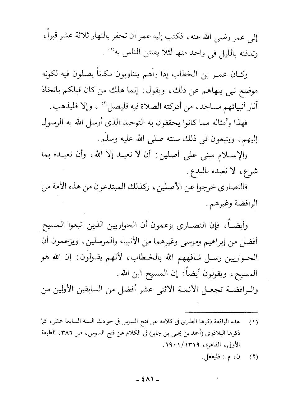 إِلَى عُمَرَ - رَضِيَ اللَّهُ عَنْهُ -، فَكَتَبَ إِلَيْهِ عُمَرُ أَنْ تَحْفُرَ بِالنَّهَارِ ثَلَاثَةَ عَشَرَ قَبْرًا، وَتَدْفِنُهُ بِاللَّيْلِ فِي وَاحِدٍ مِنْهَا لِئَلَّا يَفْتَتِنَ النَّاسُ بِهِ (¬1) .