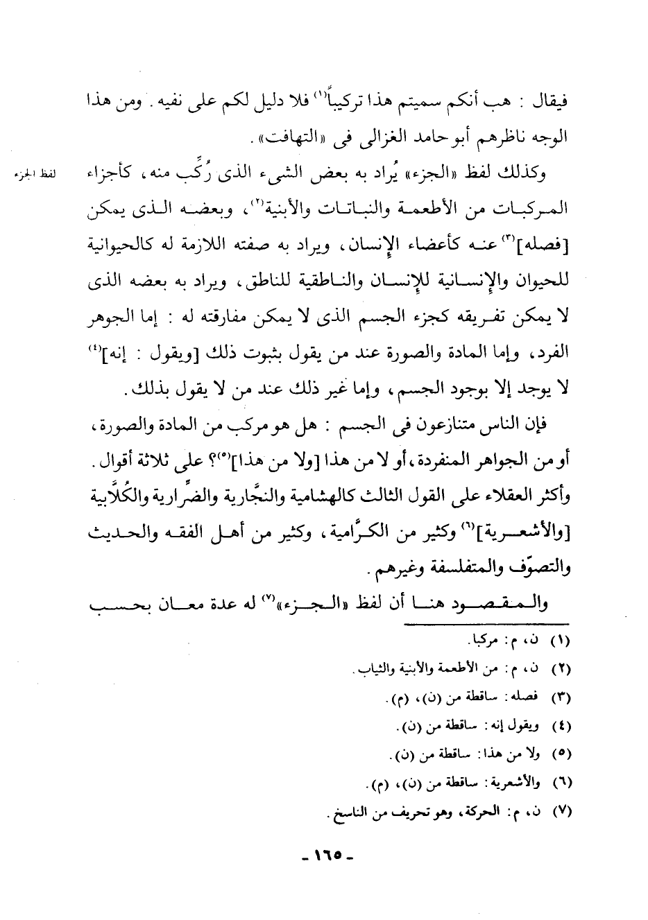 وَكَذَلِكَ لَفْظُ " الْجُزْءِ " يُرَادُ بِهِ بَعْضُ الشَّيْءِ الَّذِي رُكِّبَ مِنْهُ، كَأَجْزَاءِ الْمُرَكَّبَاتِ مِنَ الْأَطْعِمَةِ وَالنَّبَاتَاتِ وَالْأَبْنِيَةِ (¬2) ، وَبَعْضُهُ الَّذِي يُمْكِنُ [فَصْلُهُ] (¬3) عَنْهُ كَأَعْضَاءِ الْإِنْسَانِ، وَيُرَادُ بِهِ صِفَتُهُ اللَّازِمَةُ لَهُ كَالْحَيَوَانِيَّةِ لِلْحَيَوَانِ وَالْإِنْسَانِيَّةِ لِلْإِنْسَانِ وَالنَّاطِقِيَّةِ لِلنَّاطِقِ، وَيُرَادُ بِهِ بَعْضُهُ الَّذِي لَا يُمْكِنُ تَفْرِيقُهُ كَجُزْءِ الْجِسْمِ الَّذِي لَا يُمْكِنُ مُفَارَقَتُهُ لَهُ: إِمَّا الْجَوْهَرُ الْفَرْدُ، وَإِمَّا الْمَادَّةُ وَالصُّورَةُ عِنْدَ مَنْ يَقُولُ بِثُبُوتِ ذَلِكَ [وَيَقُولُ: إِنَّهُ] (¬4) لَا يُوجَدُ إِلَّا بِوُجُودِ الْجِسْمِ، وَإِمَّا غَيْرُ ذَلِكَ عِنْدَ مَنْ لَا يَقُولُ بِذَلِكَ.