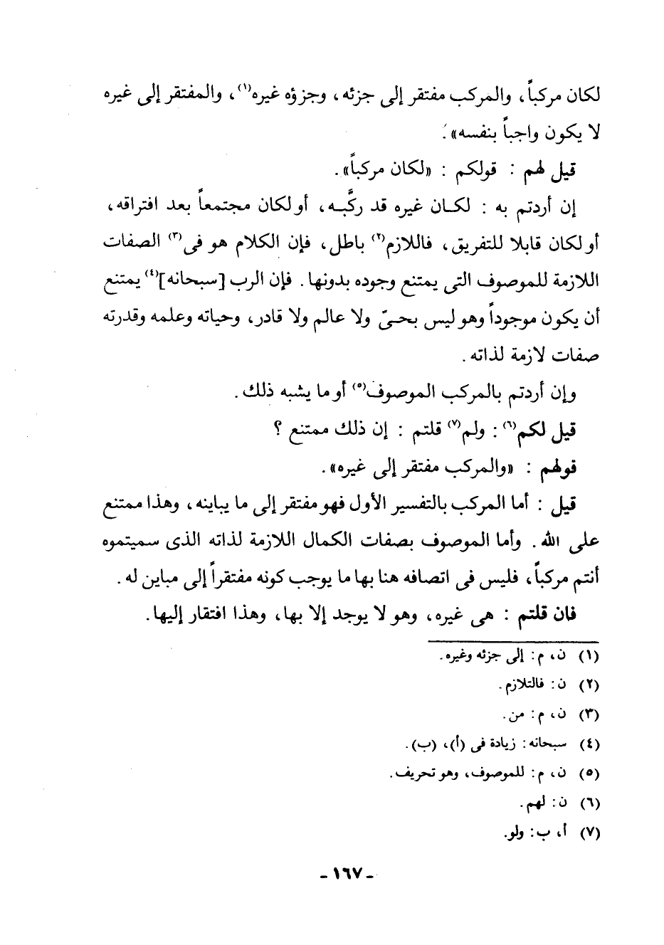 قِيلَ: أَمَّا الْمُرَكَّبُ بِالتَّفْسِيرِ الْأَوَّلِ فَهُوَ مُفْتَقِرٌ إِلَى مَا يُبَايِنُهُ، وَهَذَا مُمْتَنِعٌ عَلَى اللَّهِ. وَأَمَّا الْمَوْصُوفُ بِصِفَاتِ الْكَمَالِ اللَّازِمَةِ لِذَاتِهِ الَّذِي سَمَّيْتُمُوهُ أَنْتُمْ مُرَكَّبًا، فَلَيْسَ فِي اتِّصَافِهِ هُنَا بِهَا مَا يُوجِبُ كَوْنَهُ مُفْتَقِرًا إِلَى مُبَايِنٍ لَهُ.