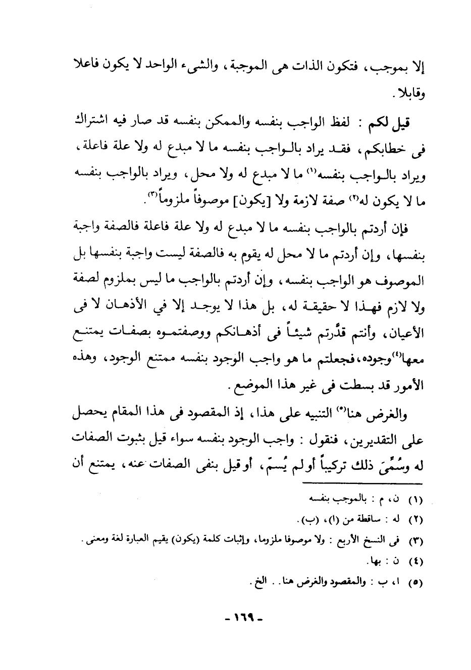 (¬3) فِي النُّسَخِ الْأَرْبَعِ: وَلَا مَوْصُوفًا مَلْزُومًا، وَإِثْبَاتُ كَلِمَةِ (يَكُونُ) يُقِيمُ الْعِبَارَةَ لُغَةً وَمَعْنًى.