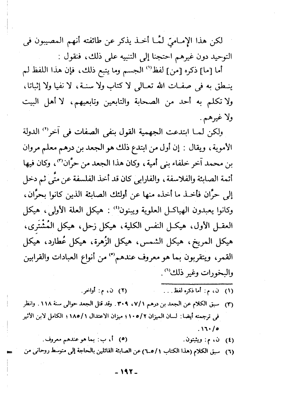 (¬6) سَبَقَ الْكَلَامُ (هَذَا الْكِتَابُ 1/5 - 6) عَنِ الصَّابِئَةِ الْقَائِلِينَ بِالْحَاجَةِ إِلَى مُتَوَسِّطٍ رُوحَانِيٍّ مِنَ الْكَوَاكِبِ أَوِ الْأَصْنَامِ، وَأَشَرْتُ هُنَاكَ إِلَى أَنَّ مَرْكَزَهُمْ كَانَ حَرَّانَ. وَحَرَّانُ - كَمَا يَذْكُرُ يَاقُوتُ فِي مُعْجَمِ الْبُلْدَانِ -: " مَدِينَةٌ عَظِيمَةٌ مَشْهُورَةٌ مِنْ جَزِيرَةِ آقُورَ، وَهِيَ قَصَبَةُ دِيَارِ مُضَرَ بَيْنَهَا وَبَيْنَ الرُّهَا يَوْمٌ وَبَيْنَ الرَّقَّةِ يَوْمَانِ وَهِيَ عَلَى طَرِيقِ الْمَوْصِلِ وَالشَّامِ وَالرُّومِ. . وَكَانَتْ مَنَازِلُ الصَّابِئَةِ وَهُمُ الْحَرَّانِيُونَ الَّذِينَ يَذْكُرُهُمْ أَصْحَابُ كُتُبِ الْمِلَلِ وَالنِّحَلِ ". وَيَتَكَلَّمُ الْبَيْرُونِيُّ (الْأَثَارِ الْبَاقِيَةِ عَنِ الْقُرُونِ الْخَالِيَةِ، ص [0 - 9] 04 - 208، ط. أَلْمَانْيَا، 1878) عَنِ الصَّابِئَةِ بِالتَّفْصِيلِ، وَمِنْ كَلَامِهِ عَنْهُمْ: " وَكَانَتْ لَهُمْ هَيَاكِلُ وَأَصْنَامٌ بِأَسْمَاءِ الشَّمْسِ مَعْلُومَةُ الْأَشْكَالِ كَمَا ذَكَرَهَا أَبُو مَعْشَرٍ الْبَلْخِيُّ فِي كِتَابِهِ: بُيُوتِ الْعِبَادَاتِ " وَانْظُرْ أَيْضًا: الْخُطَطَ لِلْمَقَرِّيزِيِّ 1/344.