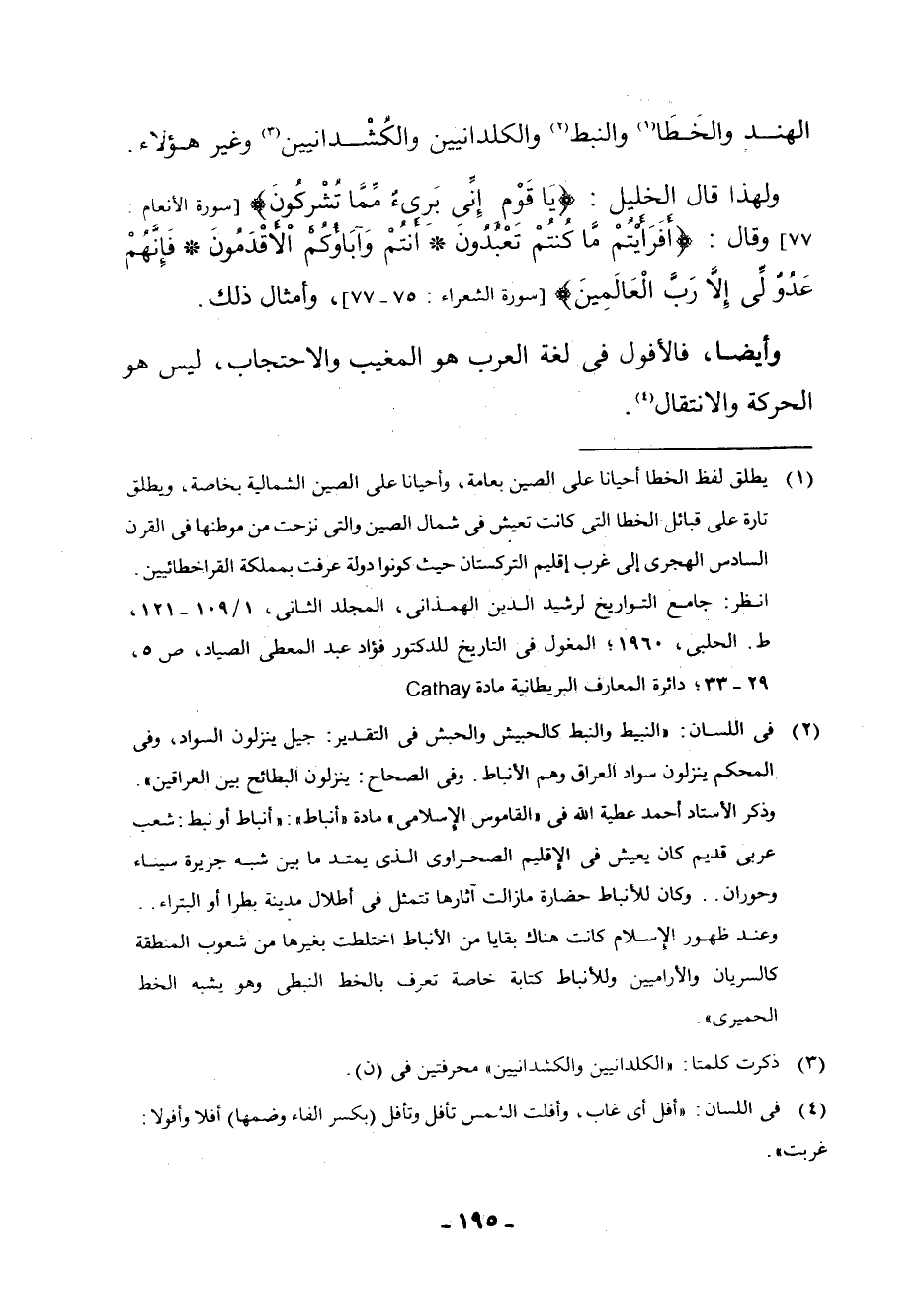 (¬2) فِي اللِّسَانِ: " النَّبِيطُ وَالنَّبَطُ كَالْحَبِيشِ وَالْحَبَشِ فِي التَّقْدِيرِ: جِيلٌ يَنْزِلُونَ السَّوَادَ، وَفِي الْمُحْكَمِ يَنْزِلُونَ سَوَادَ الْعِرَاقِ وَهُمُ الْأَنْبَاطُ. وَفِي الصِّحَاحِ: يَنْزِلُونَ الْبَطَائِحَ بَيْنَ الْعِرَاقَيْنِ ". وَذَكَرَ الْأُسْتَاذُ أَحْمَد عَطِيَّة اللَّه فِي " الْقَامُوسِ الْإِسْلَامِيِّ " مَادَّةَ: " أَنْبَاطَ " أَنْبَاطٌ أَوْ نَبَطٌ: شَعْبٌ عَرَبِيٌّ قَدِيمٌ كَانَ يَعِيشُ فِي الْإِقْلِيمِ الصَّحَرَاوِيِّ الَّذِي يَمْتَدُّ مَا بَيْنَ شِبْهِ جَزِيرَةِ سَيْنَاءَ وَحَوْرَانَ. . وَكَانَ لِلْأَنْبَاطِ حَضَارَةٌ مَازَالَتْ آثَارُهَا تَتَمَثَّلُ فِي أَطْلَالِ مَدِينَةِ بَطْرَا أَوِ الْبَتْرَاءِ. . وَعِنْدَ ظُهُورِ الْإِسْلَامِ كَانَتْ هُنَاكَ بَقَايَا مِنَ الْأَنْبَاطِ اخْتَلَطَتْ بِغَيْرِهَا مِنْ شُعُوبِ الْمِنْطَقَةِ كَالسُّرْيَانِ وَالْأَرَامِيِّينَ وَلِلْأَنْبَاطِ كِتَابَةٌ خَاصَّةٌ تُعْرَفُ بِالْخَطِّ النَّبَطِيِّ وَهُوَ يُشْبِهُ الْخَطَّ الْحِمْيَرِيِّ "