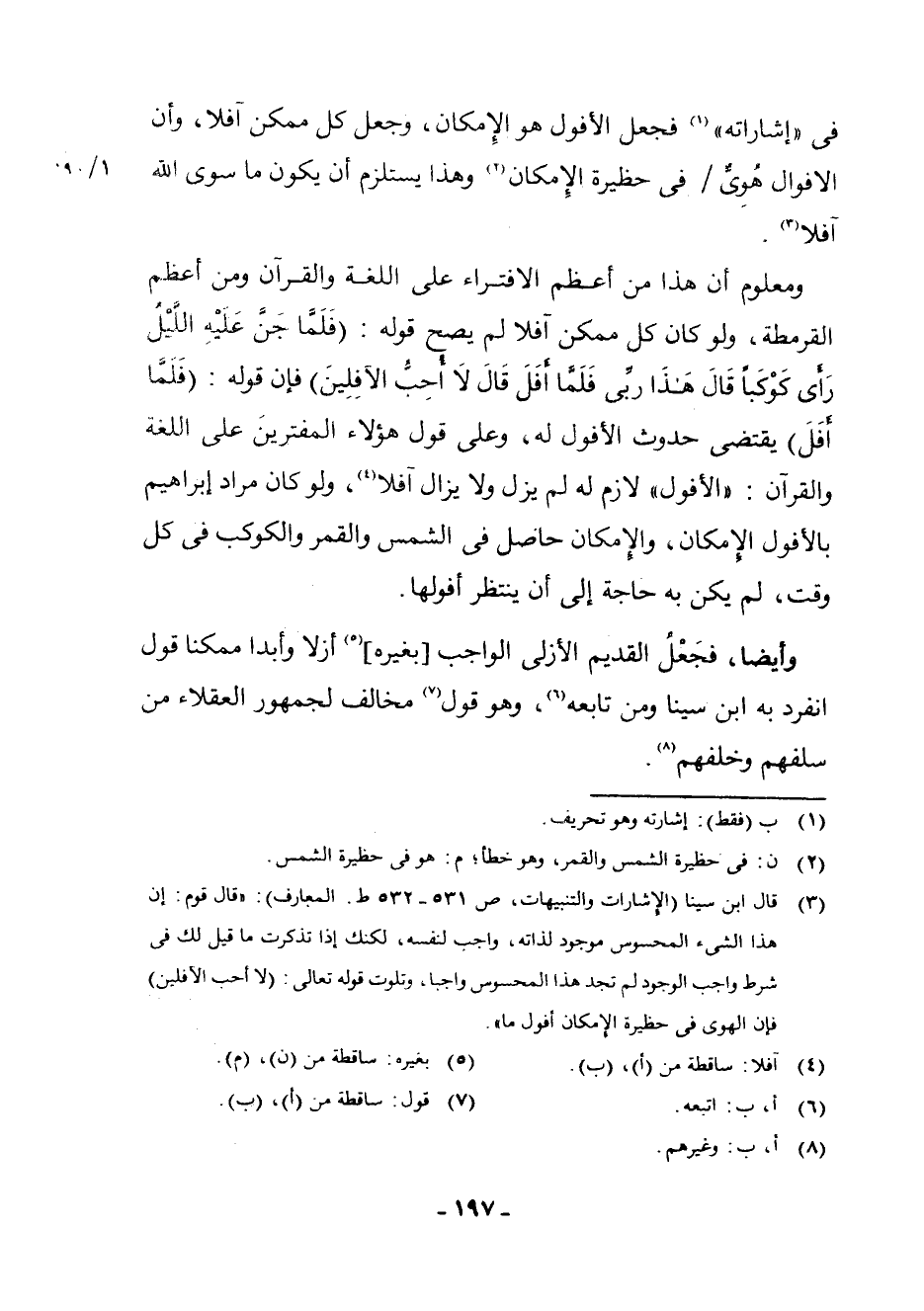 (¬3) قَالَ ابْنُ سِينَا: (الْإِشَارَاتُ التَّنْبِيهَاتُ، ص 531 - 532 ط. الْمَعَارِفِ) " قَالَ قَوْمٌ: إِنَّ هَذَا الشَّيْءَ الْمَحْسُوسَ مَوْجُودٌ لِذَاتِهِ، وَاجِبٌ لِنَفْسِهِ، لَكِنَّكَ إِذَا تَذَكَّرْتَ مَا قِيلَ لَكَ فِي شَرْطِ وَاجِبِ الْوُجُودِ لَمْ تَجِدْ هَذَا الْمَحْسُوسَ وَاجِبًا، وَتَلَوْتَ قَوْلَهُ تَعَالَى: (لَا أُحِبُّ الْآفِلِينَ) فَإِنَّ الْهَوَى فِي حَظِيرَةِ الْإِمْكَانِ أُفُولٌ مَا ".