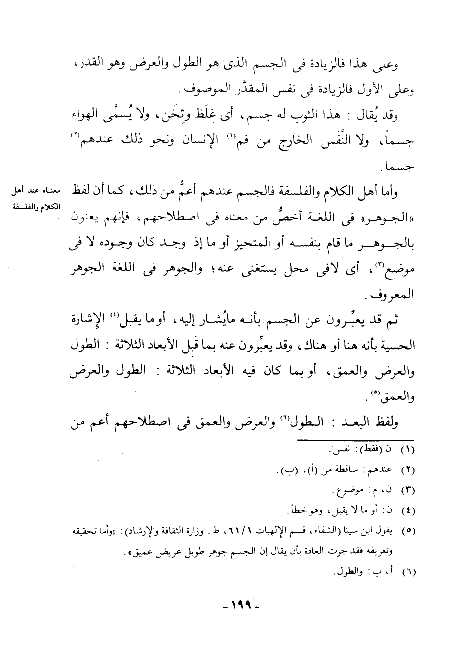 (¬5) يَقُولُ ابْنُ سِينَا: (الشِّفَاءُ، قِسْمُ الْإِلَهِيَّاتِ 1/61، ط. وِزَارَةِ الثَّقَافَةِ وَالْإِرْشَادِ) : " وَأَمَّا تَحْقِيقُهُ وَتَعْرِيفُهُ فَقَدْ جَرَتِ الْعَادَةُ بِأَنْ يُقَالَ: إِنَّ الْجِسْمَ جَوْهَرٌ طَوِيلٌ عَرِيضٌ عَمِيقٌ ".