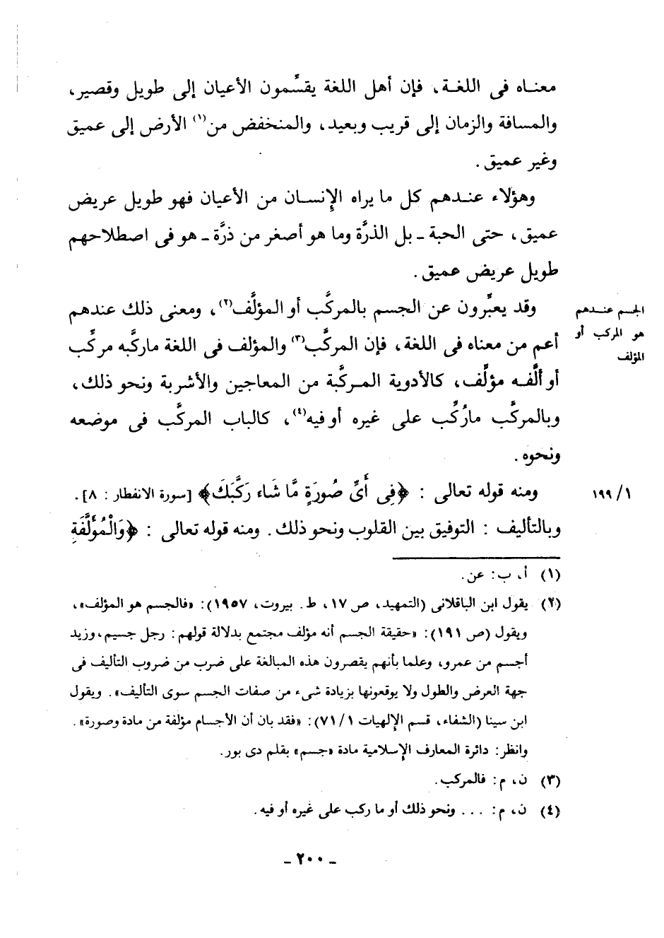 (¬2) يَقُولُ ابْنُ الْبَاقِلَّانِيِّ (التَّمْهِيدُ، ص [0 - 9] 7، بَيْرُوتُ، 1957) : " فَالْجِسْمُ هُوَ الْمُؤَلَّفُ "، وَيَقُولُ (ص 191) : " حَقِيقَةُ الْجِسْمِ أَنَّهُ مُؤَلَّفٌ مُجْتَمِعٌ بِدَلَالَةِ قَوْلِهِمْ: رَجُلٌ جَسِيمٌ، وَزَيْدٌ أَجْسَمُ مِنْ عَمْرٍو، وَعِلْمًا بِأَنَّهُمْ يَقْصُرُونَ هَذِهِ الْمُبَالَغَةَ عَلَى ضَرْبٍ مِنْ ضُرُوبِ التَّأْلِيفِ فِي جِهَةِ الْعَرْضِ وَالطُّولِ وَلَا يُوقِعُونَهَا بِزِيَادَةِ شَيْءٍ مِنْ صِفَاتِ الْجِسْمِ سِوَى التَّأْلِيفِ ". وَيَقُولُ ابْنُ سِينَا (الشِّفَاءُ، قِسْمُ الْإِلَهِيَّاتِ 1/71) : " فَقَدْ بَانَ أَنَّ الْأَجْسَامَ مُؤَلَّفَةٌ مِنْ مَادَّةٍ وَصُورَةٍ ". وَانْظُرْ دَائِرَةَ الْمَعَارِفِ الْإِسْلَامِيَّةِ مَادَّةَ " جَسَمَ " بِقَلَمِ دِي بُورْ.