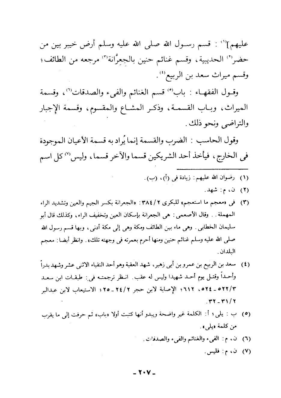 عَلَيْهِمْ] (¬1) : «قَسَّمَ رَسُولُ اللَّهِ - صَلَّى اللَّهُ عَلَيْهِ وَسَلَّمَ - أَرْضَ خَيْبَرَ بَيْنَ مَنْ حَضَرَ (¬2) الْحُدَيْبِيَةَ، وَقَسَّمَ غَنَائِمَ حُنَيْنٍ بِالْجِعْرَانَةِ (¬3) . مَرْجِعَهُ مِنَ الطَّائِفِ ; وَقَسَّمَ مِيرَاثَ سَعْدِ بْنِ الرَّبِيعِ» (¬4) .