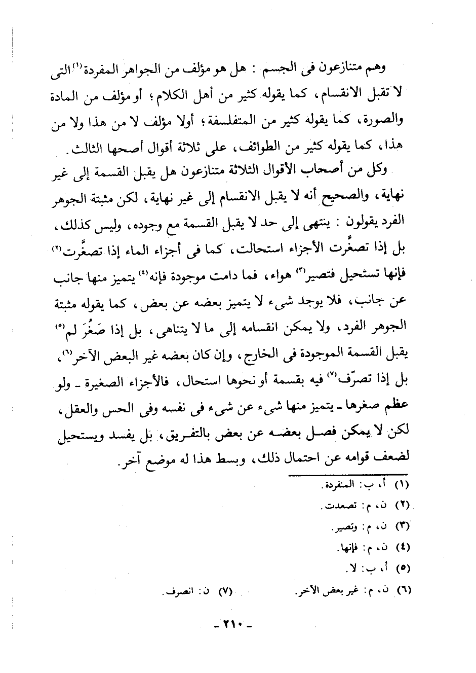 وَكُلٌّ مِنْ أَصْحَابِ الْأَقْوَالِ الثَّلَاثَةِ مُتَنَازِعُونَ هَلْ يَقْبَلُ الْقِسْمَةَ إِلَى غَيْرِ نِهَايَةٍ، وَالصَّحِيحُ أَنَّهُ لَا يَقْبَلُ الِانْقِسَامَ إِلَى غَيْرِ نِهَايَةٍ، لَكِنَّ مُثْبِتَةَ الْجَوْهَرِ الْفَرْدِ يَقُولُونَ: يَنْتَهِي إِلَى حَدٍّ لَا يَقْبَلُ الْقِسْمَةَ مَعَ وُجُودِهِ، وَلَيْسَ كَذَلِكَ، بَلْ إِذَا تَصَغَّرَتِ الْأَجْزَاءُ اسْتَحَالَتْ، كَمَا فِي أَجْزَاءِ الْمَاءِ إِذَا تَصَغَّرَتْ (¬2) فَإِنَّهَا تَسْتَحِيلُ فَتَصِيرُ (¬3) هَوَاءً، فَمَا دَامَتْ مَوْجُودَةً فَإِنَّهُ (¬4) يَتَمَيَّزُ مِنْهَا جَانِبٌ عَنْ جَانِبٍ، فَلَا يُوجَدُ شَيْءٌ لَا يَتَمَيَّزُ بَعْضُهُ عَنْ بَعْضٍ، كَمَا يَقُولُهُ مُثْبِتَةُ الْجَوْهَرِ الْفَرْدِ، وَلَا يُمْكِنُ انْقِسَامُهُ إِلَى مَا لَا يَتَنَاهَى، بَلْ إِذَا صَغُرَ (¬5) لَمْ يَقْبَلِ الْقِسْمَةَ الْمَوْجُودَةَ فِي الْخَارِجِ، وَإِنْ كَانَ بَعْضُهُ غَيْرَ الْبَعْضِ الْآخَرِ (¬6) ، بَلْ إِذَا تَصَرَّفَ (¬7) فِيهِ بِقِسْمَةٍ أَوْ نَحْوِهَا اسْتَحَالَ، فَالْأَجْزَاءُ الصَّغِيرَةُ - وَلَوْ عَظُمَ صِغَرُهَا - يَتَمَيَّزُ مِنْهَا شَيْءٌ عَنْ شَيْءٍ فِي نَفْسِهِ وَفِي الْحِسِّ وَالْعَقْلِ، لَكِنْ لَا يُمْكِنُ فَصْلُ بَعْضِهِ عَنْ بَعْضٍ بِالتَّفْرِيقِ، بَلْ يَفْسُدُ وَيَسْتَحِيلُ لِضِعْفِ قَوَامِهِ عَنِ احْتِمَالِ ذَلِكَ، وَبَسْطُ هَذَا لَهُ مَوْضِعٌ آخَرُ.
