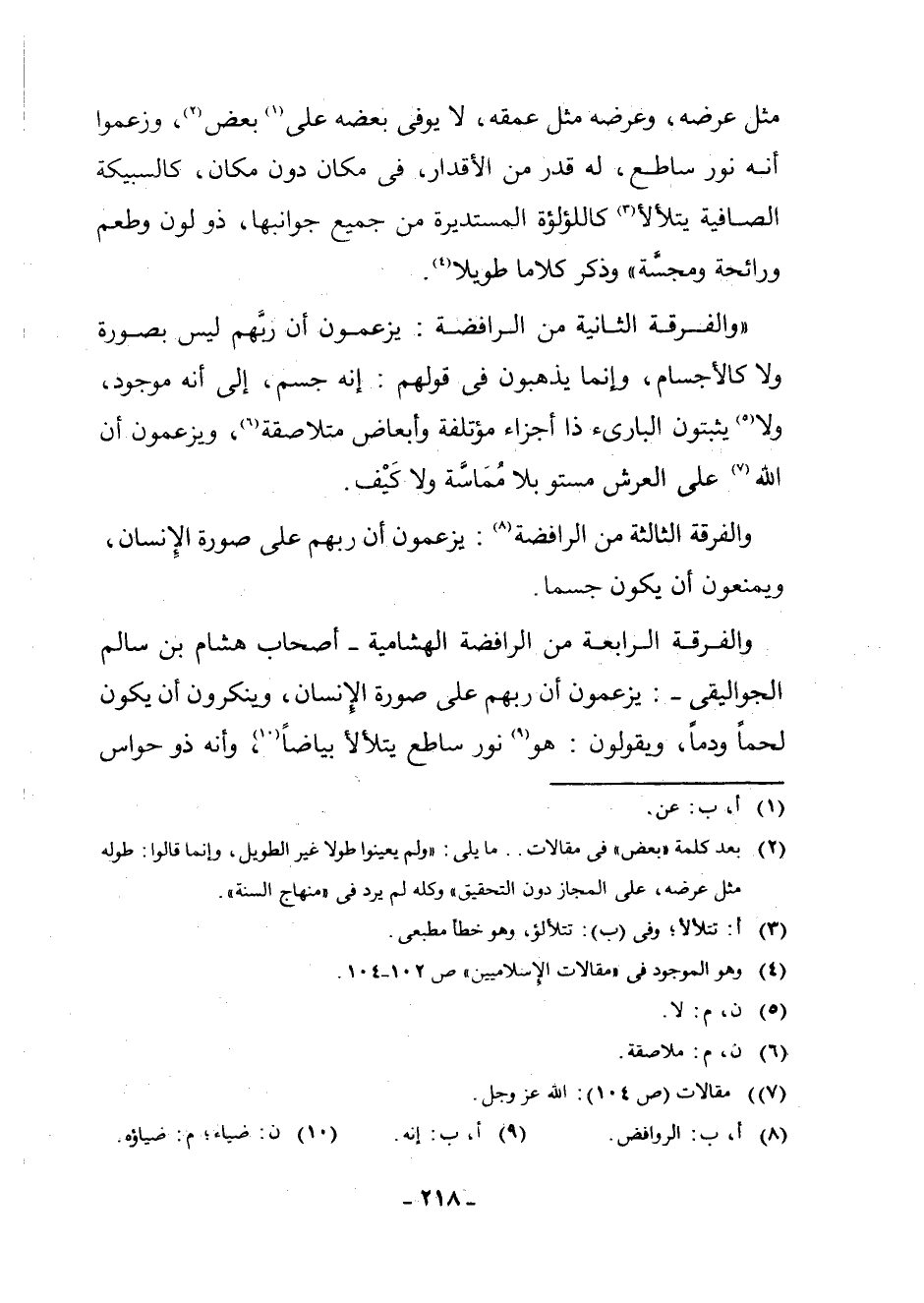 (¬2) بَعْدَ كَلِمَةِ " بَعْضٍ " فِي مَقَالَاتِ. . مَا يَلِي: " وَلَمْ يُعَيِّنُوا طُولًا غَيْرَ الطَّوِيلِ، وَإِنَّمَا قَالُوا: طُولُهُ مِثْلُ عَرْضِهِ، عَلَى الْمَجَازِ دُونَ التَّحْقِيقِ " وَكُلُّهُ لَمْ يَرِدْ فِي " مِنْهَاجِ السُّنَّةِ ".