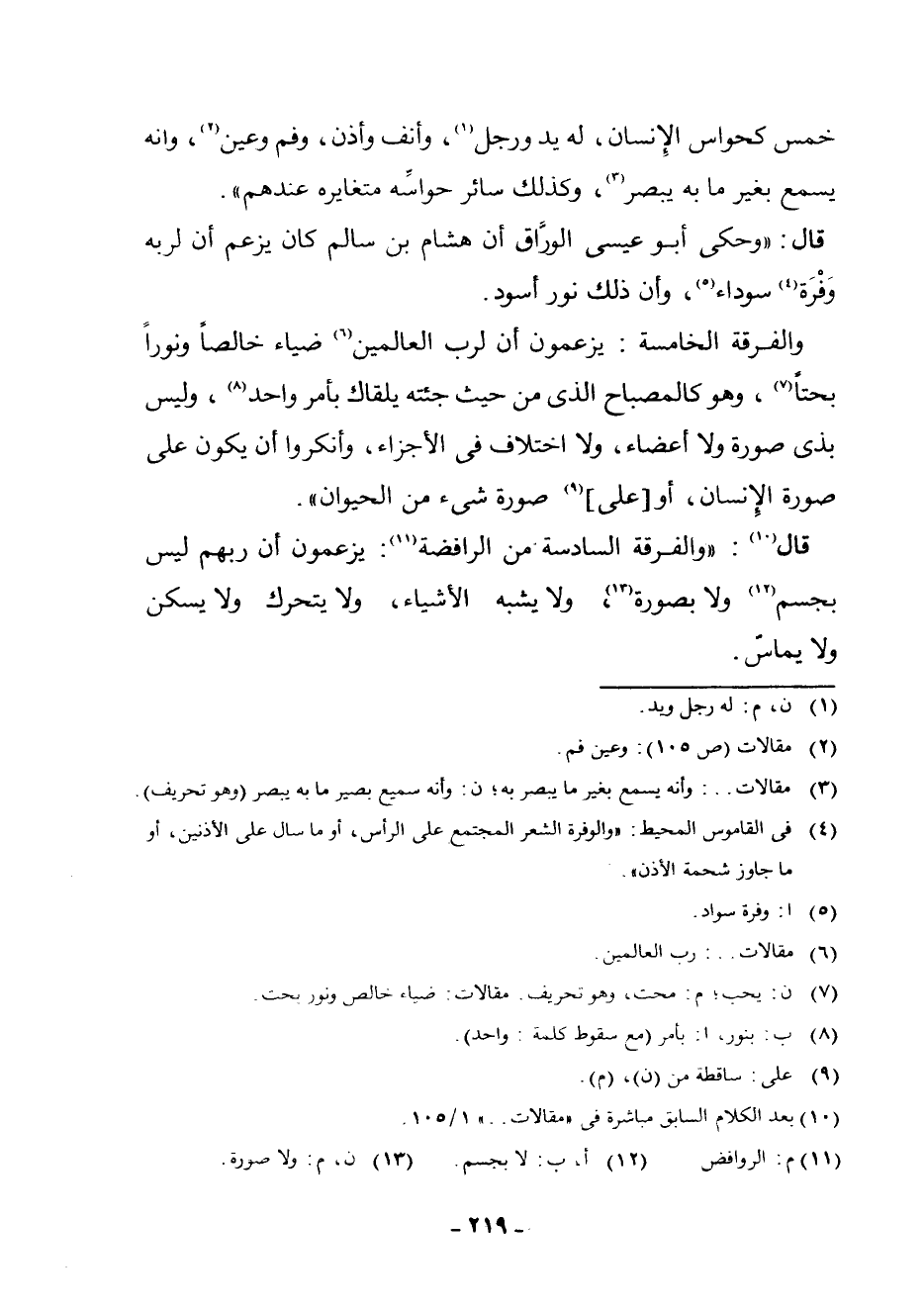 (¬3) مَقَالَاتٌ. .: وَأَنَّهُ يَسْمَعُ بِغَيْرِ مَا يُبْصِرُ بِهِ ; ن: وَأَنَّهُ سَمِيعٌ بَصِيرٌ مَا بِهِ يُبْصِرُ (وَهُوَ تَحْرِيفٌ) .