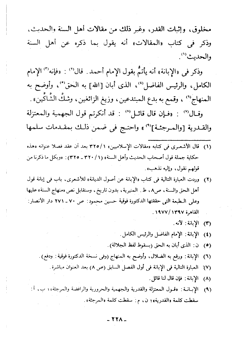 (¬1) قَالَ الْأَشْعَرِيُّ فِي كِتَابِهِ " مَقَالَاتِ الْإِسْلَامِيِّينَ " 1/325 بَعْدَ أَنَّ عَقَدَ فَصْلًا عُنْوَانُهُ " هَذِهِ حِكَايَةُ جُمْلَةِ قَوْلِ أَصْحَابِ الْحَدِيثِ وَأَهْلِ السُّنَّةِ " (1/320 - 325) : " وَبِكُلِّ مَا ذَكَرْنَا مِنْ قَوْلِهِمْ نَقُولُ، وَإِلَيْهِ نَذْهَبُ ".