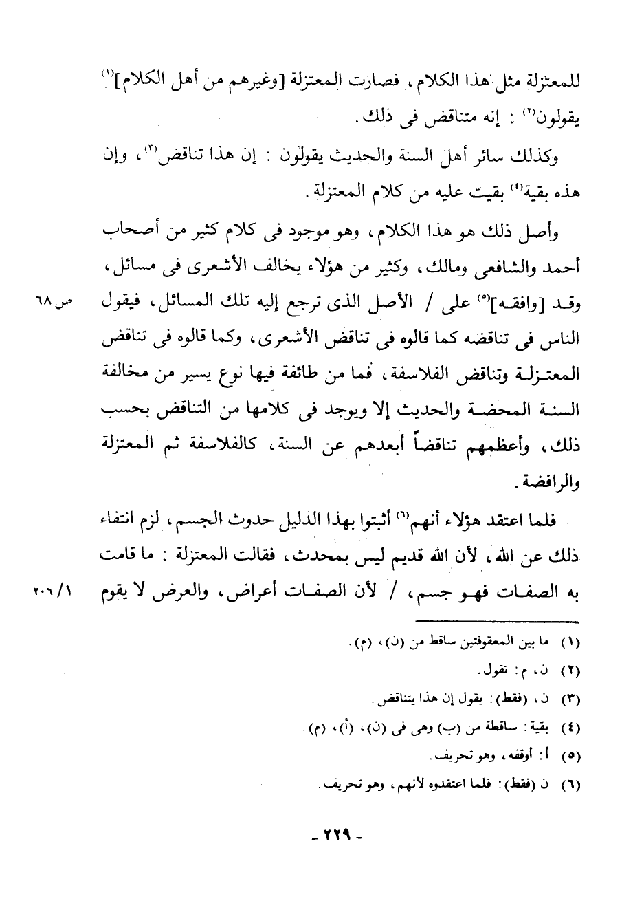 لِلْمُعْتَزِلَةِ مِثْلِ هَذَا الْكَلَامِ، فَصَارَتِ الْمُعْتَزِلَةُ [وَغَيْرُهُمْ مِنْ أَهْلِ الْكَلَامِ] (¬1) يَقُولُونَ (¬2) : إِنَّهُ مُتَنَاقِضٌ فِي ذَلِكَ.