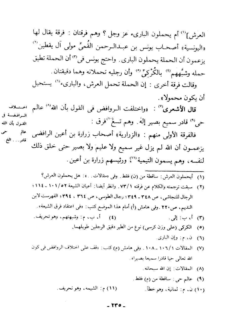 (¬7) الْمَقَالَاتِ 1/106 - 108. وَفِي هَامِشِ (م) كُتِبَ: " قِفْ عَلَى اخْتِلَافِ. الرَّوَافِضِ فِي كَوْنِ اللَّهِ تَعَالَى حَيًّا قَادِرًا سَمِيعًا بَصِيرًا ".