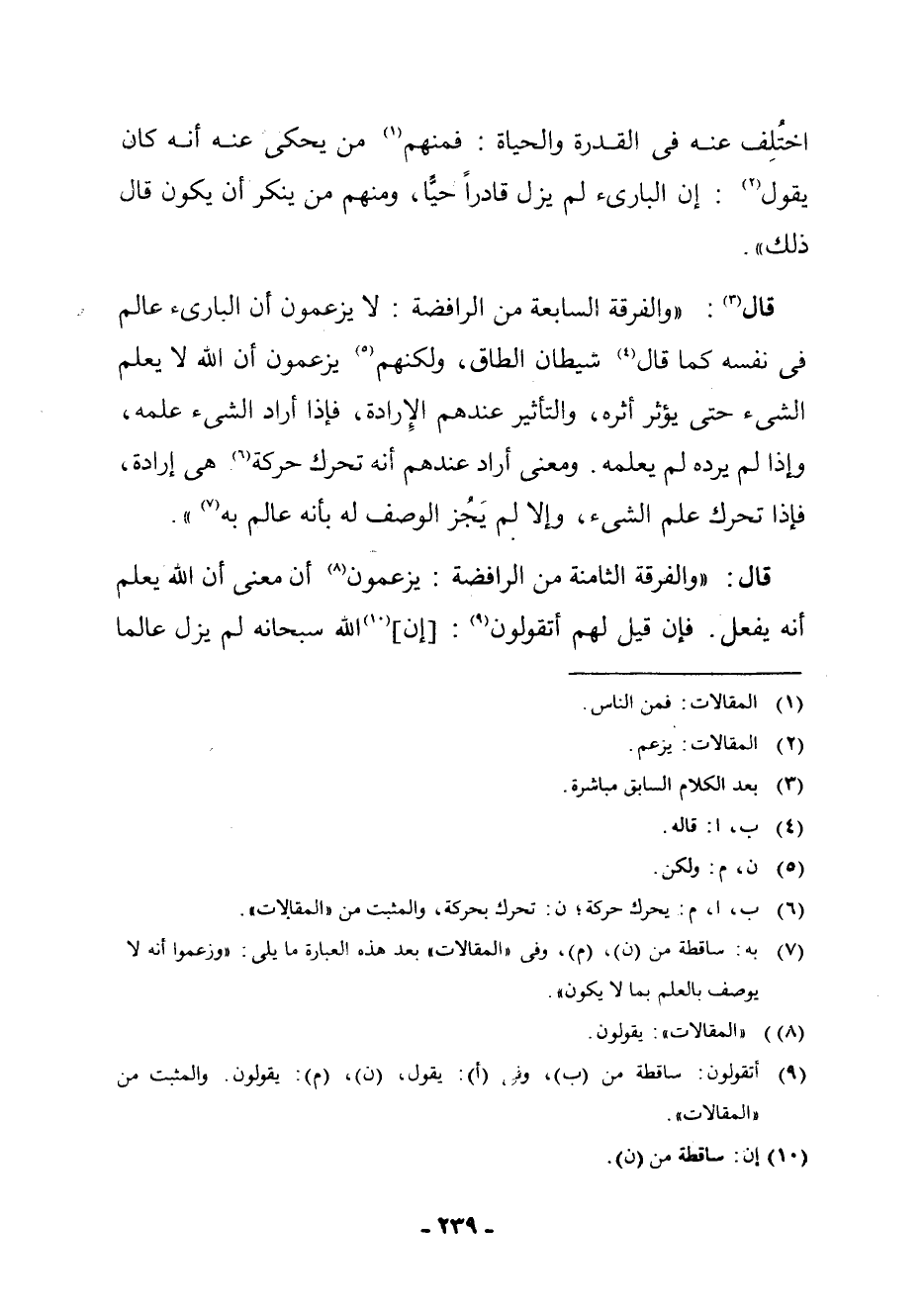 (¬7) بِهِ: سَاقِطَةٌ مِنْ (ن) ، (م) ، وَفِي " الْمَقَالَاتِ " بَعْدَ هَذِهِ الْعِبَارَةِ مَا يَلِي: " وَزَعَمُوا أَنَّهُ لَا يُوصَفُ بِالْعِلْمِ بِمَا لَا يَكُونُ ".