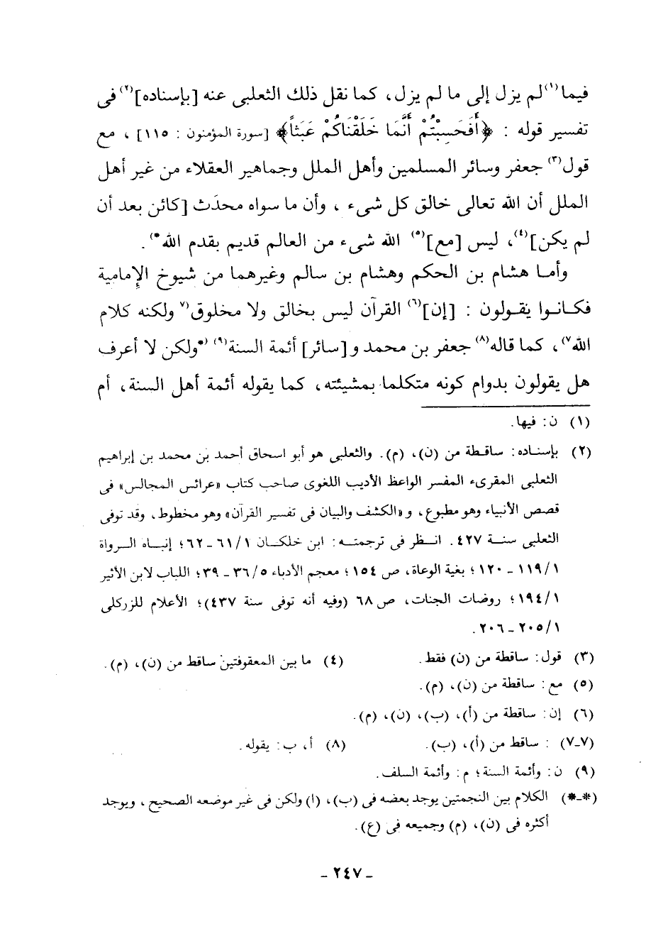 فِيمَا (¬1) لَمْ يَزَلْ إِلَى مَا لَمْ يَزَلْ، كَمَا نَقَلَ ذَلِكَ الثَّعْلَبِيُّ عَنْهُ [بِإِسْنَادِهِ] (¬2) فِي تَفْسِيرِ قَوْلِهِ: {أَفَحَسِبْتُمْ أَنَّمَا خَلَقْنَاكُمْ عَبَثًا} [سُورَةُ الْمُؤْمِنُونَ: 115] ، مَعَ قَوْلِ (¬3) جَعْفَرٍ وَسَائِرِ الْمُسْلِمِينَ وَأَهْلِ الْمِلَلِ وَجَمَاهِيرِ الْعُقَلَاءِ مِنْ غَيْرِ أَهْلِ الْمِلَلِ أَنَّ اللَّهَ تَعَالَى خَالِقُ كُلِّ شَيْءٍ، وَأَنَّ مَا سِوَاهُ مُحْدَثٌ [كَائِنٌ بَعْدَ أَنْ لَمْ يَكُنْ] (¬4) ، لَيْسَ [مَعَ] (¬5) اللَّهِ شَيْءٌ مِنَ الْعَالَمِ قَدِيمٌ بِقِدَمِ اللَّهِ *) (¬6) .
