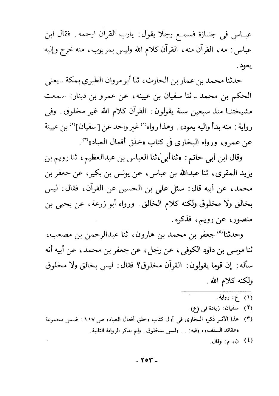 (¬3) هَذَا الْأَثَرُ ذَكَرَهُ الْبُخَارِيُّ فِي أَوَّلِ كِتَابِ " خَلْقِ أَفْعَالِ الْعِبَادِ " ص [0 - 9] 17: ضِمْنَ مَجْمُوعَةِ " عَقَائِدِ السَّلَفِ "، وَفِيهِ:. . وَلَيْسَ بِمَخْلُوقٍ وَلَمْ يَذْكُرِ الرِّوَايَةَ الثَّانِيَةَ.