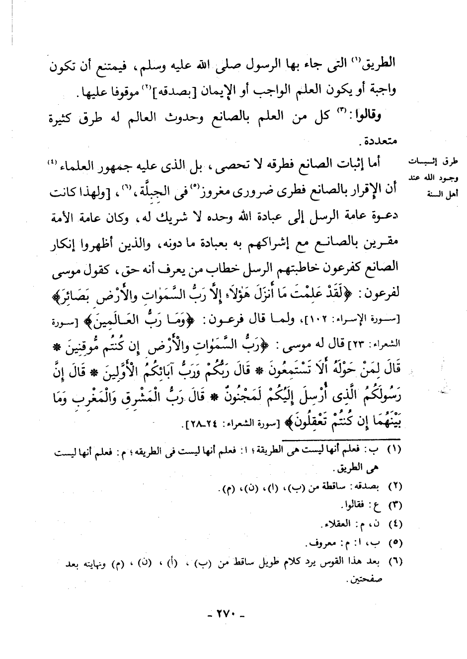 أَمَّا إِثْبَاتُ الصَّانِعِ فَطَرْقُهُ لَا تُحْصَى، بَلِ الَّذِي عَلَيْهِ جُمْهُورُ الْعُلَمَاءِ (¬4) أَنَّ الْإِقْرَارَ بِالصَّانِعِ فِطْرِيٌّ ضَرُورِيٌّ مَغْرُوزٌ (¬5) فِي الْجِبِلَّةِ، (¬6) ، [وَلِهَذَا كَانَتْ دَعْوَةُ عَامَّةِ الرُّسُلِ إِلَى عِبَادَةِ اللَّهِ وَحْدَهُ لَا شَرِيكَ لَهُ، وَكَانَ عَامَّةُ الْأُمَّةِ مُقِرِّينَ بِالصَّانِعِ مَعَ إِشْرَاكِهِمْ بِهِ بِعِبَادَةِ مَا دُونِهُ، وَالَّذِينَ أَظْهَرُوا إِنْكَارَ الصَّانِعِ كَفِرْعَوْنَ خَاطَبَتْهُمُ الرُّسُلُ خِطَابَ مَنْ يَعْرِفُ أَنَّهُ حَقٌّ، كَقَوْلِ مُوسَى لِفِرْعَوْنَ: {لَقَدْ عَلِمْتَ مَا أَنْزَلَ هَؤُلَاءِ إِلَّا رَبُّ السَّمَاوَاتِ وَالْأَرْضِ بَصَائِرَ} [سُورَةُ الْإِسْرَاءِ: 102] ، وَلَمَّا قَالَ فِرْعَوْنُ: {وَمَا رَبُّ الْعَالَمِينَ} [سُورَةُ الشُّعَرَاءِ: 23] ، قَالَ لَهُ مُوسَى: {رَبُّ السَّمَاوَاتِ وَالْأَرْضِ وَمَا بَيْنَهُمَا إِنْ كُنْتُمْ مُوقِنِينَ قَالَ لِمَنْ حَوْلَهُ أَلَا تَسْتَمِعُونَ قَالَ رَبُّكُمْ وَرَبُّ آبَائِكُمُ الْأَوَّلِينَ قَالَ إِنَّ رَسُولَكُمُ الَّذِي أُرْسِلَ إِلَيْكُمْ لَمَجْنُونٌ قَالَ رَبُّ الْمَشْرِقِ وَالْمَغْرِبِ وَمَا بَيْنَهُمَا إِنْ كُنْتُمْ تَعْقِلُونَ} [سُورَةُ الشُّعَرَاءِ: 24 - 28] .