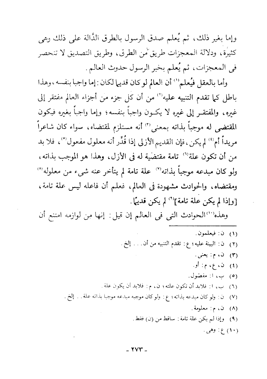 (¬7) ن: وَلَوْ كَانَ مُبْدِعُهُ بِذَاتِهِ ; ع: وَلَوْ كَانَ مُوجِبُهُ مُبْدِعُهُ مُوجِبًا بِذَاتِهِ عِلَّةً. . إِلَخْ.