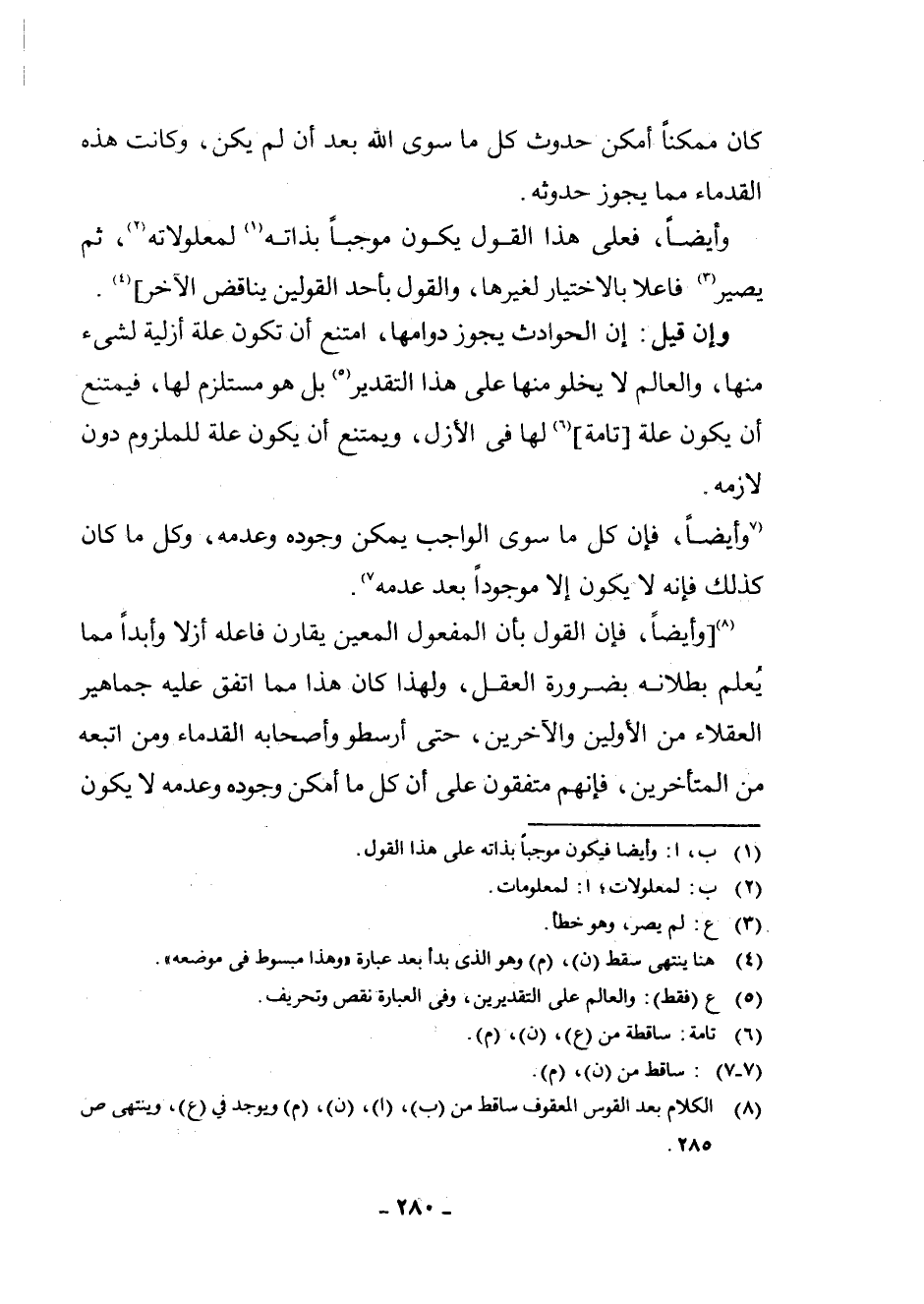 (7 وَأَيْضًا، فَإِنَّ كُلَّ مَا سِوَى الْوَاجِبِ يُمْكِنُ وُجُودُهُ وَعَدَمُهُ، وَكُلُّ مَا كَانَ كَذَلِكَ فَإِنَّهُ لَا يَكُونُ إِلَّا مَوْجُودًا بَعْدَ عَدَمِهِ 7) (¬5) . (¬6) (¬7) . [وَأَيْضًا، فَإِنَّ الْقَوْلَ بِأَنَّ الْمَفْعُولَ الْمُعَيَّنَ يُقَارِنُ فَاعِلَهُ أَزَلًا وَأَبَدًا مِمَّا يُعْلَمُ بُطْلَانُهُ بِضَرُورَةِ الْعَقْلِ، وَلِهَذَا كَانَ هَذَا مِمَّا اتَّفَقَ عَلَيْهِ جَمَاهِيرُ الْعُقَلَاءِ مِنَ الْأَوَّلِينَ وَالْآخَرِينَ، حَتَّى أَرِسْطُو وَأَصْحَابِهِ الْقُدَمَاءِ وَمَنِ اتَّبَعَهُ مِنَ الْمُتَأَخِّرِينَ، فَإِنَّهُمْ مُتَّفِقُونَ عَلَى أَنَّ كُلَّ مَا أَمْكَنَ وُجُودُهُ وَعَدَمُهُ لَا يَكُونُ