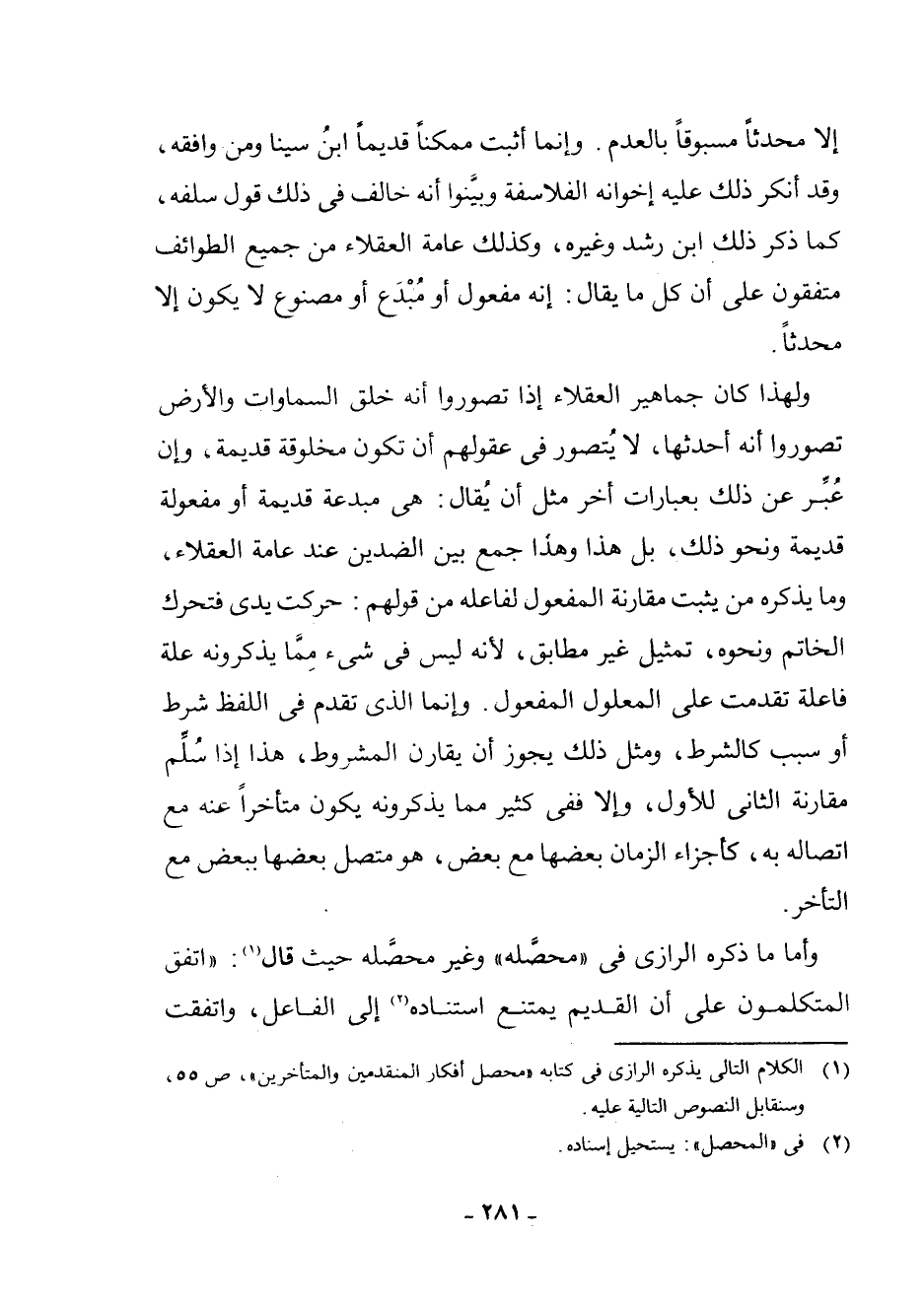 (¬1) الْكَلَامُ التَّالِي يَذْكُرُهُ الرَّازِيُّ فِي كِتَابِهِ " مُحَصَّلُ أَفْكَارِ الْمُتَقَدِّمِينَ وَالْمُتَأَخِّرِينَ "، ص [0 - 9] 5، وَسَنُقَابِلُ النُّصُوصَ التَّالِيَةَ عَلَيْهِ