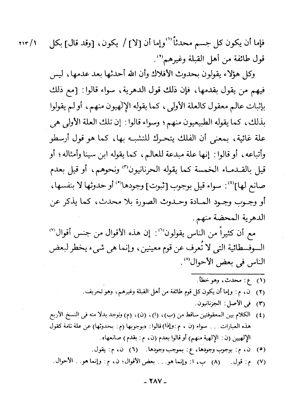 (¬4) الْكَلَامُ بَيْنَ الْمَعْقُوفَتَيْنِ سَاقِطٌ مِنْ (ب) ، (أ) ، (ن) ، (م) وَتُوجَدُ بَدَلًا مِنْهُ فِي النُّسَخِ الْأَرْبَعِ هَذِهِ الْعِبَارَاتُ. . . سَوَاءٌ (ن، م: وَإِذَا) قَالُوا: " بِوُجُوبِهَا (م: بِحُدُوثِهَا) عَنْ عِلَّةٍ تَامَّةٍ كَقَوْلِ الْإِلَهِيِّينَ (ن: الْإِلَهِيَّةِ مِنْهُمْ) أَوْ قَالُوا بِعَدَمِ (ن، م: بِقِدَمِ) صَانِعِهَا "