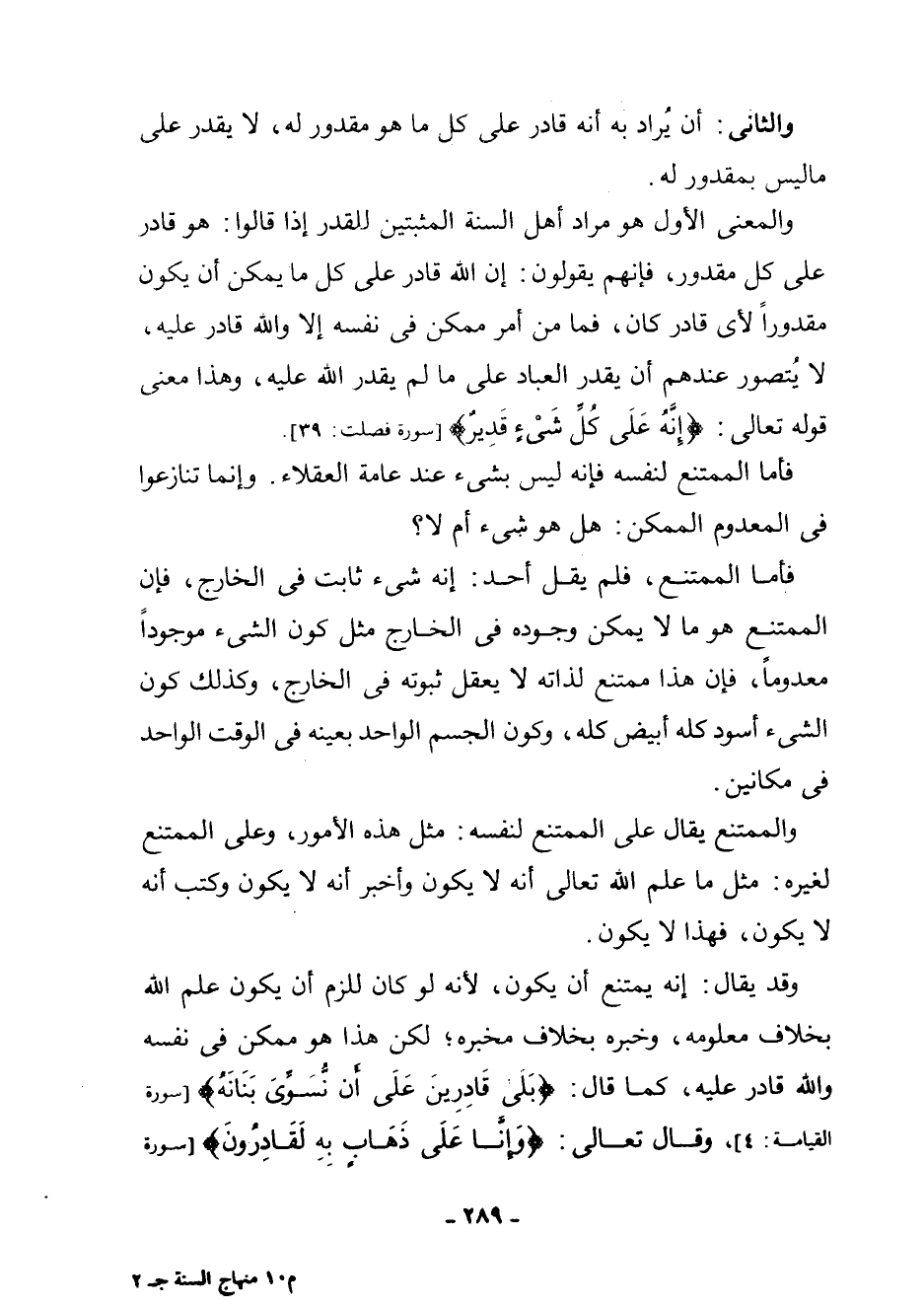 وَالْمَعْنَى الْأَوَّلُ هُوَ مُرَادُ أَهْلِ السُّنَّةِ الْمُثْبِتِينَ لِلْقَدَرِ إِذَا قَالُوا: هُوَ قَادِرٌ عَلَى كُلِّ مَقْدُورٍ، فَإِنَّهُمْ يَقُولُونَ: إِنَّ اللَّهَ قَادِرٌ عَلَى كُلِّ مَا يُمْكِنُ أَنْ يَكُونَ مَقْدُورًا لِأَيِّ قَادِرٍ كَانَ، فَمَا مِنْ أَمْرٍ مُمْكِنٍ فِي نَفْسِهِ إِلَّا وَاللَّهُ قَادِرٌ عَلَيْهِ، لَا يُتَصَوَّرُ عِنْدَهُمْ أَنْ يَقْدِرَ الْعِبَادُ عَلَى مَا لَمْ يَقْدِرِ اللَّهُ عَلَيْهِ، وَهَذَا مَعْنَى قَوْلِهِ تَعَالَى: {إِنَّهُ عَلَى كُلِّ شَيْءٍ قَدِيرٌ} [سُورَةُ فُصِّلَتْ: 39] .