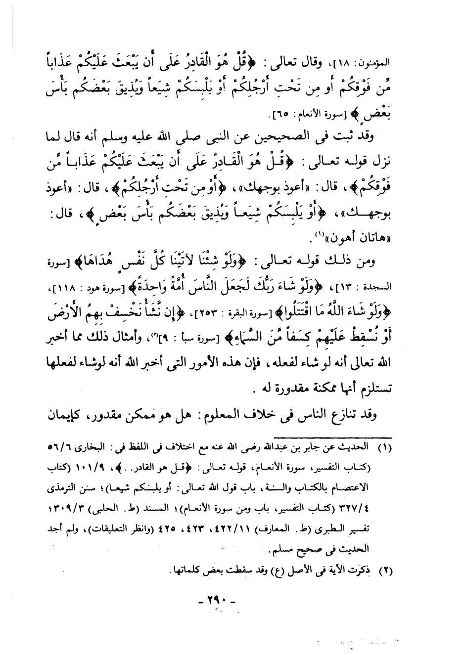 (¬1) الْحَدِيثُ عَنْ جَابِرِ بْنِ عَبْدِ اللَّهِ - رَضِيَ اللَّهُ عَنْهُ - مَعَ اخْتِلَافٍ فِي اللَّفْظِ فِي: الْبُخَارِيِّ 6/56 (كِتَابُ التَّفْسِيرِ، سُورَةُ الْأَنْعَامِ، قَوْلُهُ تَعَالَى: " قُلْ هُوَ الْقَادِرُ. . "، 9/101 (كِتَابُ الِاعْتِصَامِ بِالْكِتَابِ وَالسُّنَّةِ، بَابُ قَوْلِ اللَّهِ تَعَالَى: أَوْ يَلْبِسَكُمْ شِيَعًا) ; سُنَنِ التِّرْمِذِيِّ 4/327 (كِتَابُ التَّفْسِيرِ، بَابُ وَمِنْ سُورَةِ الْأَنْعَامِ) ; الْمُسْنَدِ (ط. الْحَلَبِيِّ) 3/309; تَفْسِيرِ الطَّبَرِيِّ (ط. الْمَعَارِفِ) 11/422، 423، 425 (وَانْظُرِ التَّعْلِيقَاتِ) ، وَلَمْ أَجِدِ الْحَدِيثَ فِي صَحِيحِ مُسْلِمٍ