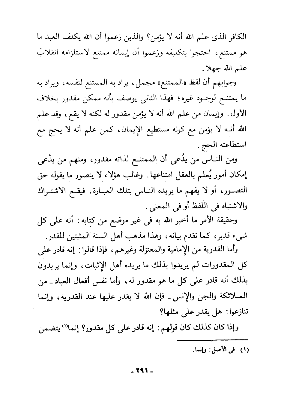 وَأَمَّا الْقَدَرِيَّةُ مِنَ الْإِمَامِيَّةِ وَالْمُعْتَزِلَةِ وَغَيْرِهِمْ، فَإِذَا قَالُوا: إِنَّهُ قَادِرٌ عَلَى كُلِّ الْمَقْدُورَاتِ لَمْ يُرِيدُوا بِذَلِكَ مَا يُرِيدُهُ أَهْلُ الْإِثْبَاتِ، وَإِنَّمَا يُرِيدُونَ بِذَلِكَ أَنَّهُ قَادِرٌ عَلَى كُلِّ مَا هُوَ مَقْدُورٌ لَهُ، وَأَمَّا نَفْسُ أَفْعَالِ الْعِبَادِ - مِنَ الْمَلَائِكَةِ وَالْجِنِّ وَالْإِنْسِ - فَإِنَّ اللَّهَ لَا يَقْدِرُ عَلَيْهَا عِنْدَ الْقَدَرِيَّةِ، وَإِنَّمَا تَنَازَعُوا: هَلْ يَقْدِرُ عَلَى مِثْلِهَا؟
