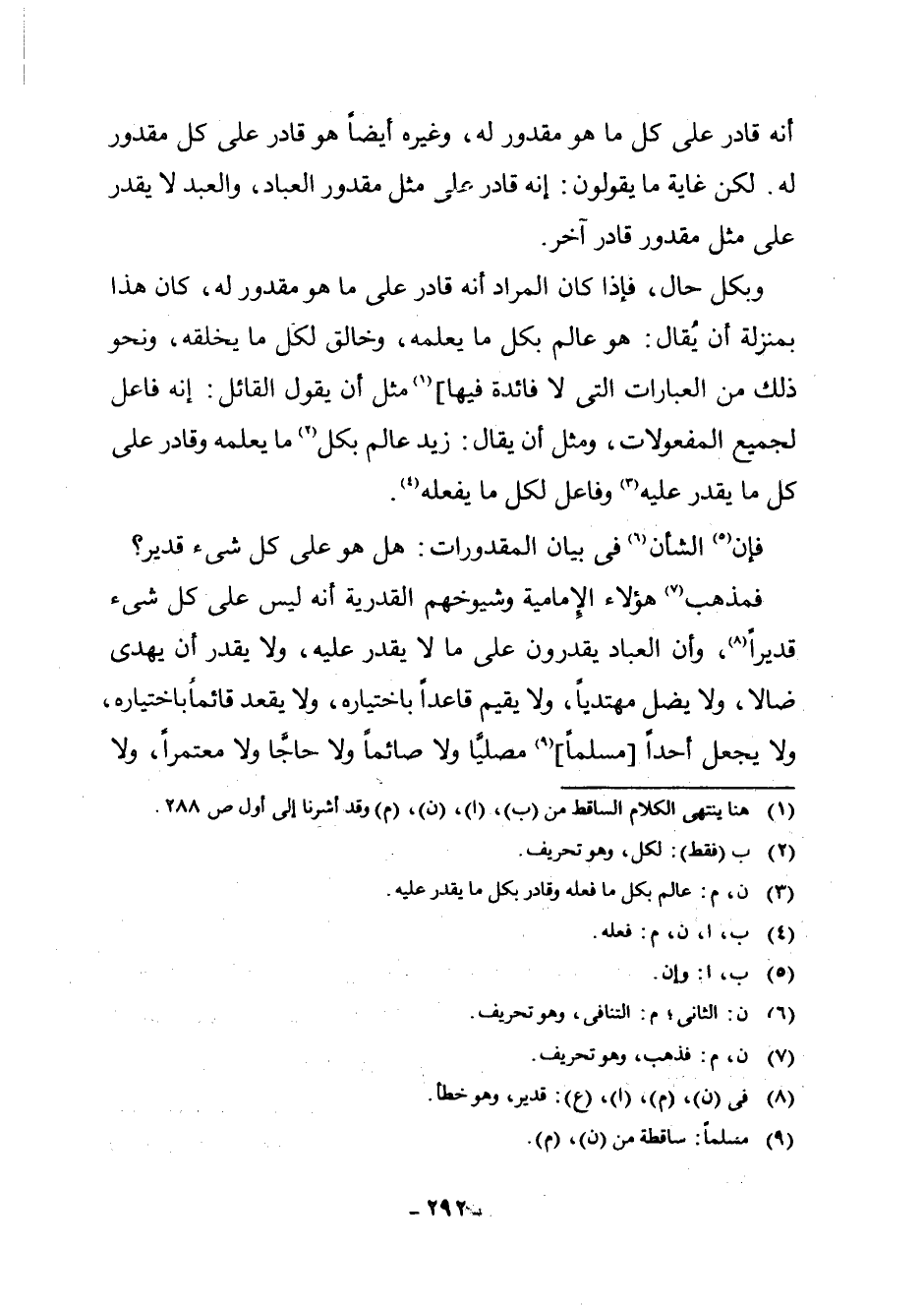 فَإِنَّ (¬5) . الشَّأْنَ (¬6) . فِي بَيَانِ الْمَقْدُورَاتِ: هَلْ هُوَ عَلَى كُلِّ شَيْءٍ قَدِيرٌ؟ فَمَذْهَبُ (¬7) . هَؤُلَاءِ الْإِمَامِيَّةِ وَشُيُوخِهِمُ الْقَدَرِيَّةِ أَنَّهُ لَيْسَ عَلَى كُلِّ شَيْءٍ قَدِيرًا (¬8) .، وَأَنَّ الْعِبَادَ يَقْدِرُونَ عَلَى مَا لَا يَقْدِرُ عَلَيْهِ، وَلَا يَقْدِرُ أَنْ يَهْدِيَ ضَالًّا، وَلَا يُضِلَّ مُهْتَدِيًا، وَلَا يُقِيمَ قَاعِدًا بِاخْتِيَارِهِ، وَلَا يُقْعِدَ قَائِمًا بِاخْتِيَارِهِ، وَلَا يَجْعَلَ أَحَدًا [مُسْلِمًا] (¬9) . مُصَلِّيًا وَلَا صَائِمًا وَلَا حَاجًّا وَلَا مُعْتَمِرًا، وَلَا