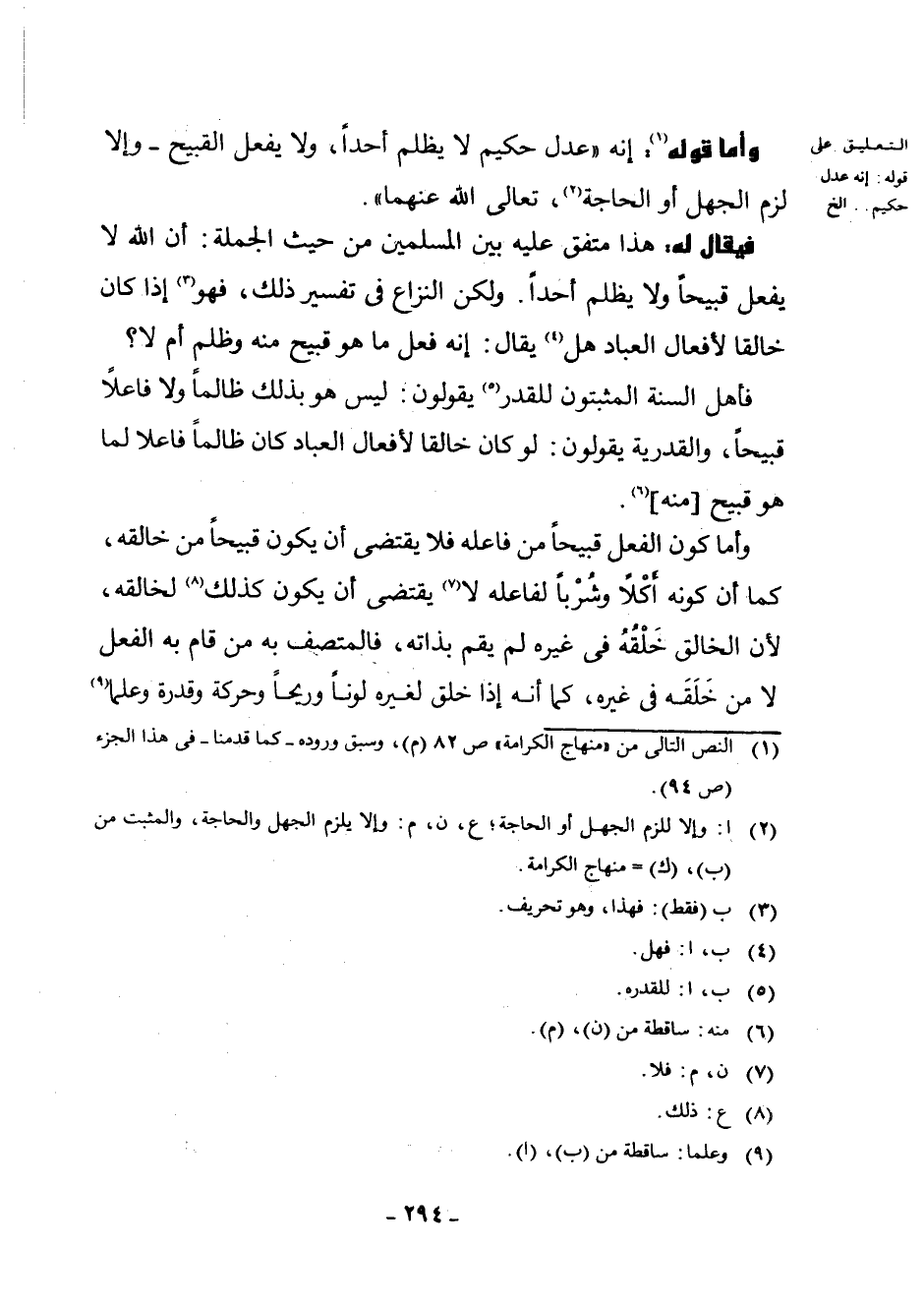 وَأَمَّا قَوْلُهُ (¬1) .: إِنَّهُ " عَدْلٌ حَكِيمٌ لَا يَظْلِمُ أَحَدًا، وَلَا يَفْعَلُ الْقَبِيحَ - وَإِلَّا لَزِمَ الْجَهْلُ أَوِ الْحَاجَةُ (¬2) ، تَعَالَى اللَّهُ عَنْهُمَا ".