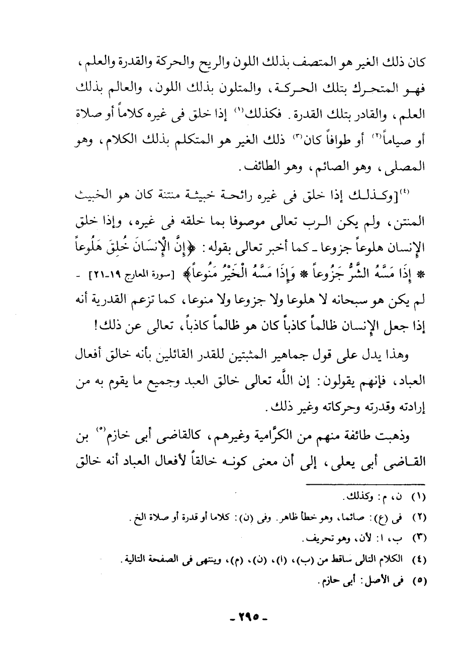 كَانَ ذَلِكَ الْغَيْرُ هُوَ الْمُتَّصِفَ بِذَلِكَ اللَّوْنِ وَالرِّيحِ وَالْحَرَكَةِ وَالْقُدْرَةِ وَالْعِلْمِ، فَهُوَ الْمُتَحَرِّكُ بِتِلْكَ الْحَرَكَةِ، وَالْمُتَلَوِّنُ بِذَلِكَ اللَّوْنِ، وَالْعَالِمُ بِذَلِكَ الْعِلْمِ، وَالْقَادِرُ بِتِلْكَ الْقُدْرَةِ، فَكَذَلِكَ (¬1) . إِذَا خَلَقَ فِي غَيْرِهِ كَلَامًا أَوْ صَلَاةً أَوْ صِيَامًا (¬2) . أَوْ طَوَافًا كَانَ (¬3) . ذَلِكَ الْغَيْرُ هُوَ الْمُتَكَلِّمَ بِذَلِكَ الْكَلَامِ، وَهُوَ الْمُصَلِّي، وَهُوَ الصَّائِمَ، وَهُوَ الطَّائِفَ. (¬4) . [وَكَذَلِكَ إِذَا خَلَقَ فِي غَيْرِهِ رَائِحَةً خَبِيثَةً مُنْتِنَةً كَانَ هُوَ الْخَبِيثَ الْمُنْتِنَ، وَلَمْ يَكُنِ الرَّبُّ تَعَالَى مَوْصُوفًا بِمَا خَلَقَهُ فِي غَيْرِهِ، وَإِذَا خَلَقَ الْإِنْسَانَ هَلُوعًا جَزُوعًا - كَمَا أَخْبَرَ تَعَالَى بِقَوْلِهِ: {إِنَّ الْإِنْسَانَ خُلِقَ هَلُوعًا إِذَا مَسَّهُ الشَّرُّ جَزُوعًا وَإِذَا مَسَّهُ الْخَيْرُ مَنُوعًا} [سُورَةُ الْمَعَارِجِ: 19 - 21]- لَمْ يَكُنْ هُوَ سُبْحَانَهُ لَا هَلُوعًا وَلَا جَزُوعًا وَلَا مَنُوعًا، كَمَا تَزْعُمُ الْقَدَرِيَّةُ أَنَّهُ إِذَا جَعَلَ الْإِنْسَانَ ظَالِمًا كَاذِبًا كَانَ هُوَ ظَالِمًا كَاذِبًا، تَعَالَى عَنْ ذَلِكَ!