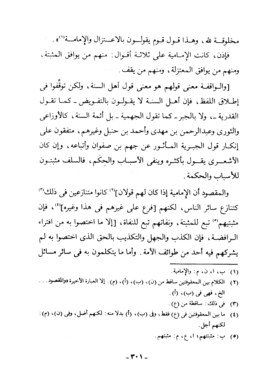 [وَالْوَاقِفَةُ مَعْنَى قَوْلِهِمْ هُوَ مَعْنَى قَوْلِ أَهْلِ السُّنَّةِ، وَلَكِنْ تَوَقَّفُوا فِي إِطْلَاقِ اللَّفْظِ، فَإِنَّ أَهْلَ السُّنَّةِ لَا يَقُولُونَ بِالتَّفْوِيضِ - كَمَا تَقُولُ الْقَدَرِيَّةُ -، وَلَا بِالْجَبْرِ - كَمَا تَقُولُ الْجَهْمِيَّةُ - بَلْ أَئِمَّةُ السُّنَّةِ، كَالْأَوْزَاعِيِّ وَالثَّوْرِيِّ وَعَبْدِ الرَّحْمَنِ بْنِ مَهْدِيٍّ وَأَحْمَدَ بْنِ حَنْبَلٍ وَغَيْرِهِمْ، مُتَّفِقُونَ عَلَى إِنْكَارِ قَوْلِ الْجَبْرِيَّةِ الْمَأْثُورِ عَنْ جَهْمِ بْنِ صَفْوَانَ وَأَتْبَاعِهِ، وَإِنْ كَانَ الْأَشْعَرِيُّ يَقُولُ بِأَكْثَرِهِ وَيَنْفِي الْأَسْبَابَ وَالْحِكَمَ، فَالسَّلَفُ مُثْبِتُونَ لِلْأَسْبَابِ وَالْحِكْمَةِ.
