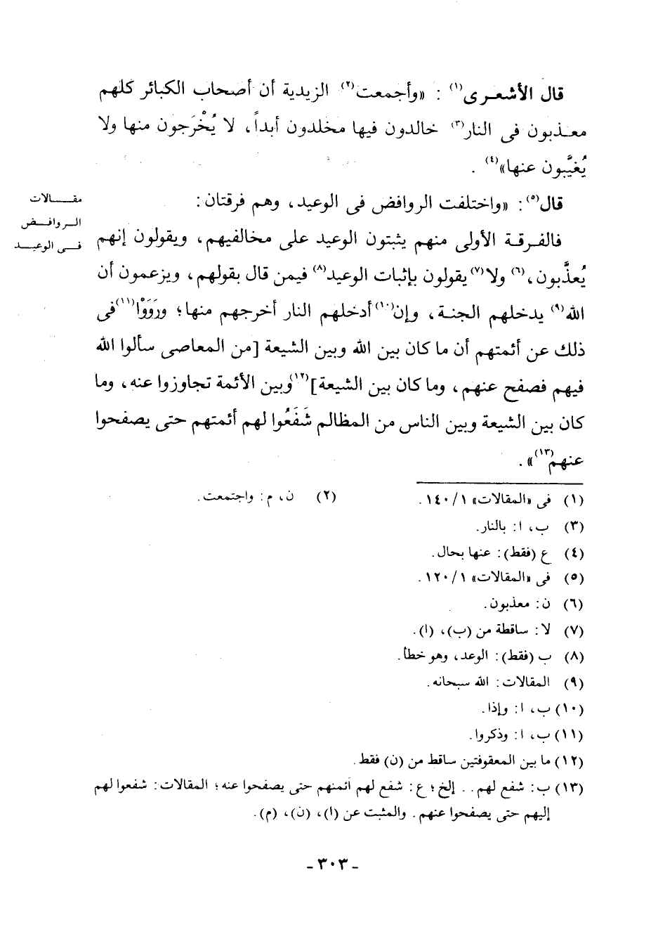 قَالَ (¬5) : " وَاخْتَلَفَتِ الرَّوَافِضُ فِي الْوَعِيدِ، وَهُمْ فِرْقَتَانِ: فَالْفِرْقَةُ الْأُولَى مِنْهُمْ يُثْبِتُونَ الْوَعِيدَ عَلَى مُخَالِفِيهِمْ، وَيَقُولُونَ إِنَّهُمْ يُعَذَّبُونَ، (¬6) وَلَا (¬7) يَقُولُونَ بِإِثْبَاتِ الْوَعِيدِ (¬8) فِيمَنْ قَالَ بِقَوْلِهِمْ، وَيَزْعُمُونَ أَنَّ اللَّهَ (¬9) يُدْخِلُهُمُ الْجَنَّةَ، وَإِنْ (¬10) أَدْخَلَهُمُ النَّارَ أَخْرَجَهُمْ مِنْهَا ; وَرَوَوْا (¬11) فِي ذَلِكَ عَنْ أَئِمَّتِهِمْ أَنَّ مَا كَانَ بَيْنَ اللَّهِ وَبَيْنَ الشِّيعَةِ [مِنَ الْمَعَاصِي سَأَلُوا اللَّهَ فِيهِمْ فَصَفَحَ عَنْهُمْ، وَمَا كَانَ بَيْنَ الشِّيعَةِ] (¬12) وَبَيْنَ الْأَئِمَّةِ تَجَاوَزُوا عَنْهُ، وَمَا كَانَ بَيْنَ الشِّيعَةِ وَبَيْنَ النَّاسِ مِنَ الْمَظَالِمِ شَفَعُوا لَهُمْ أَئِمَّتُهُمْ حَتَّى يَصْفَحُوا عَنْهُمْ (¬13) ".